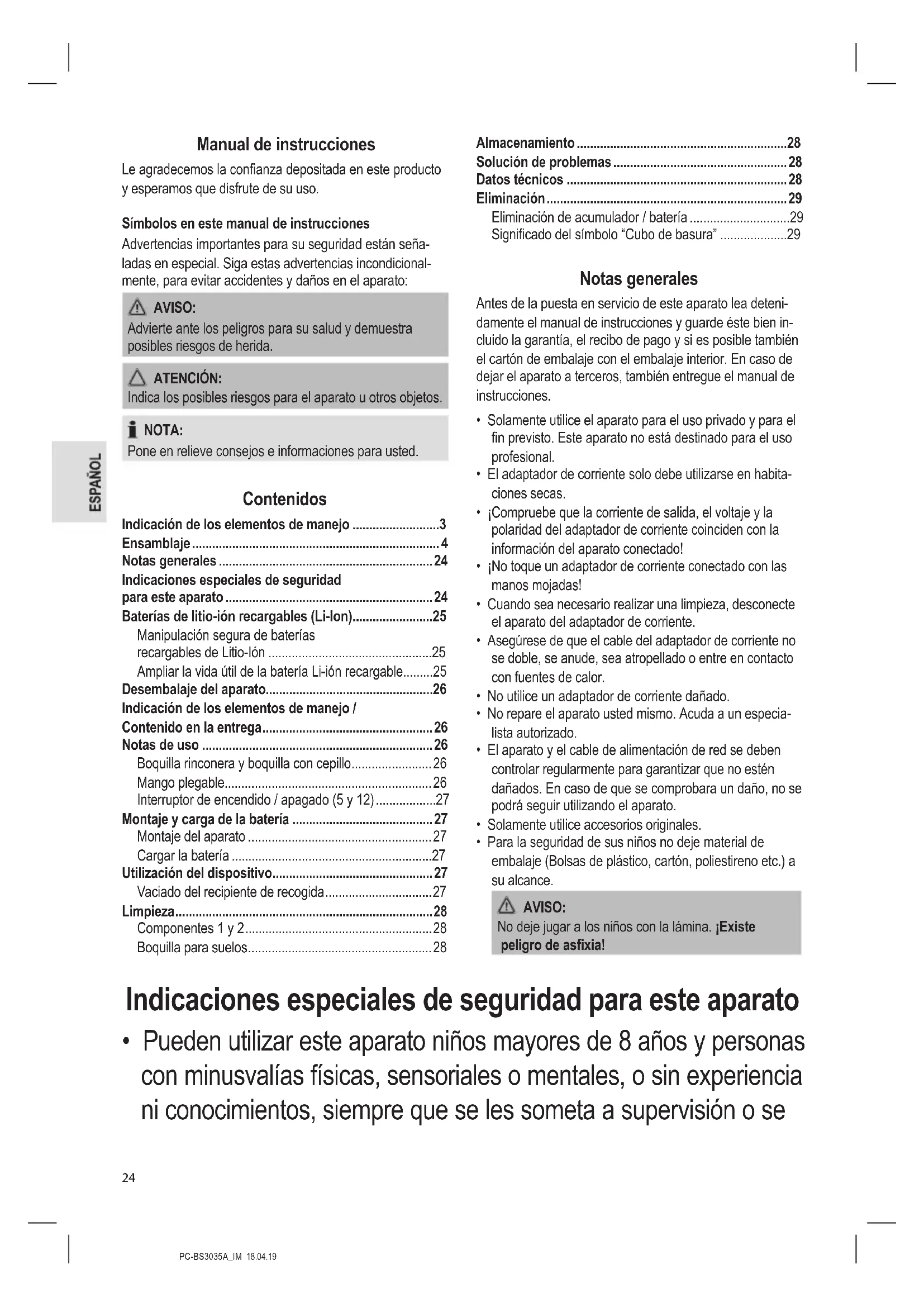 - Mantenga siempre el aparato fuera del alcance de los niños en un lugar seco y bien ventilado. Solución de problemas Problema Causa posible Solución El aparato no funciona. La batería recarga- ble está agotada. Cargue la batería. Baja potencia de succión. Batería casi descargada. Cargue la batería. Los ltros están sucios. Limpie los ltros como se describe en “Limpieza”. ATENCIÓN: ¡Vuelva a utilizar la aspiradora exclusi- vamente con ltros secos! Ruidos durante el uso. Se ha aspirado un cuerpo extraño en la boquilla para suelos. Saque el cuerpo extraño. En caso necesario, separe la boquilla para suelos del soporte del aparato. Datos técnicos Modelo: ........................................................... PC-BS 3035 A Peso neto: .......................................................... aprox. 2,8 kg Toma de corriente Clase de protección: ....................................................... Entrada: ................. CA 100 - 240 V, 50 / 60 Hz, 0,35 A MAX Salida:......................................................CC 18 V, 500 mA Polaridad: .............................................................. Batería: .........................................4 × 3,7 V, 2200 mAh Li-Ión Tiempo de funcionamiento:...........Máximo de 20 minutos Tiempo de carga: ................................................4,5 horas El derecho de realizar modicaciones técnicas y de diseño en el curso del desarrollo continuo del producto está reservado. Este aparato se ha examinado según las normativas actuales y vigentes de la Comunidad Europea, como p.ej. compatibilidad electromagnética y directiva de baja tensión y se ha construido según las más nuevas especicaciones en razón de la seguridad.PC-BS3035A_IM 18.04.19