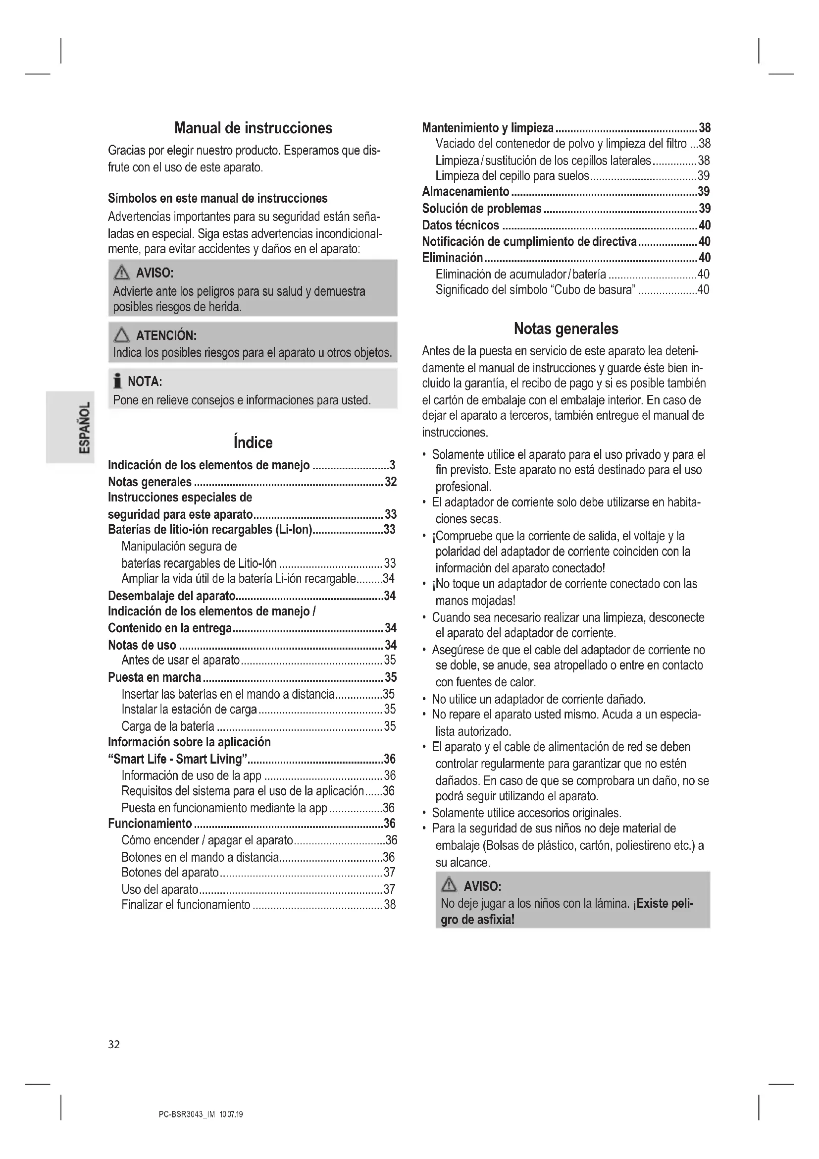 - Para la seguridad de sus niños no deje material de embalaje (Bolsas de plástico, cartón, poliestireno etc.) a su alcance. AVISO: No deje jugar a los niños con la lámina. ¡Existe peli- gro de asxia!PC-BSR3043_IM 10.07.19
