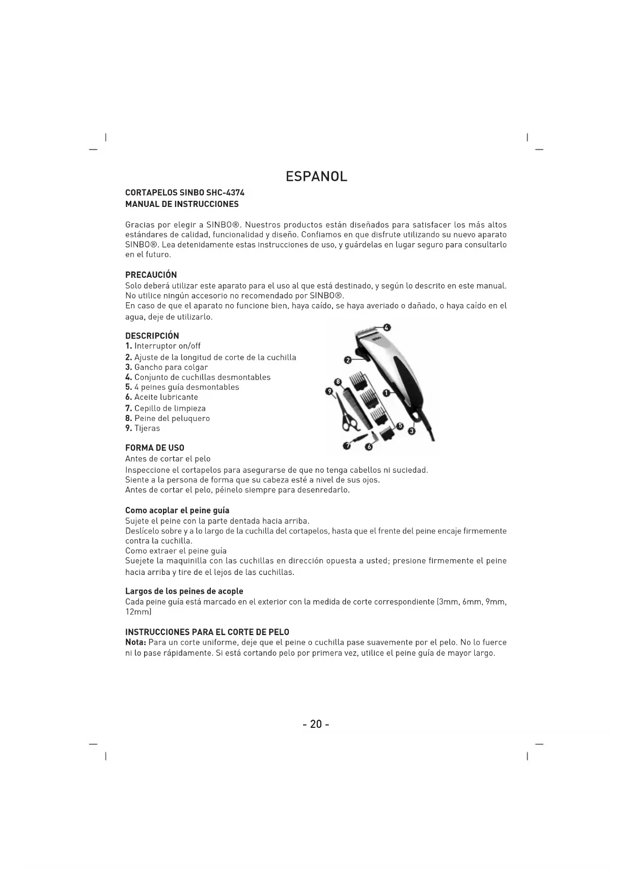 ADVERTENCIA - PARA REDUCIR EL RIESGO DE QUEMADURAS, ELECTROCUCIÓN, INCENDIO O LESIONES A LAS PERSONAS: Ningún aparato deberá dejarse jamás desatendido cuando esté enchufado a una toma de corriente. Mantenga el cable de corriente lejos de superficies calientes. Asegúrese de que ni el cable de corriente ni la clavija se mojen nunca. No enchufe ni desenchufe nunca el cortapelos con las manos mojadas. No utilice el cortapelos si el cable está dañado. Podrá obtener un cable de recambio en el servicio técnico de SINBO®. Cargue, utilice y guarde el cortapelos a una temperatura entre 15˚C y 35˚C. Para limpiarlo, desenchúfelo siempre de la corriente. Utilice únicamente los accesorios incluidos. Mantenga el cortapelos lejos del alcance de los niños. El uso de este aparato por personas con discapacidades físicas, sensoriales o mentales o falta de experiencia y conocimiento puede implicar riesgos. Las personas responsables de su seguridad deberían dar las instrucciones explícitas o supervisar el uso del aparato. CARACTERÍSTICAS - Conjunto de cuchillas desmontables de fácil limpieza - Cuchilla de acero inoxidable para corte fino - Cuchillas autoafilables - Motor súper magnético- 23 - - Excelente filo - Pulsador: para el control máximo del estilo - 4 peines guía: para una variedad de longitudes y opciones de estilo Accesorios: - 1tijeras - 1peine de peluquero - 1cepillo para limpieza - 1aceite lubricante - 1protector de cuchilla - 4 guías para corte (3, 6, 9,12mm) - 230V CA, 50Hz, 9W