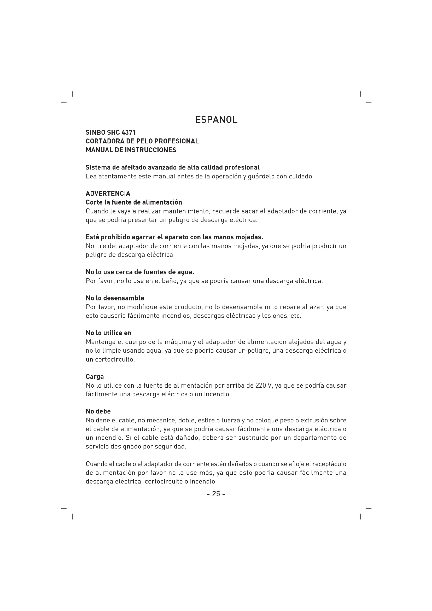 Sistema de afeitado avanzado de alta calidad profesional Lea atentamente este manual antes de la operación y guárdelo con cuidado. ADVERTENCIA Corte la fuente de alimentación Cuando le vaya a realizar mantenimiento, recuerde sacar el adaptador de corriente, ya que se podría presentar un peligro de descarga eléctrica. Está prohibido agarrar el aparato con las manos mojadas. No tire del adaptador de corriente con las manos mojadas, ya que se podría producir un peligro de descarga eléctrica. No lo use cerca de fuentes de agua. Por favor, no lo use en el baño, ya que se podría causar una descarga eléctrica. No lo desensamble Por favor, no modifique este producto, no lo desensamble ni lo repare al azar, ya que esto causaría fácilmente incendios, descargas eléctricas y lesiones, etc. No lo utilice en Mantenga el cuerpo de la máquina y el adaptador de alimentación alejados del agua y no lo limpie usando agua, ya que se podría causar un peligro, una descarga eléctrica o un cortocircuito. Carga No lo utilice con la fuente de alimentación por arriba de 220 V, ya que se podría causar fácilmente una descarga eléctrica o un incendio. No debe No dañe el cable, no mecanice, doble, estire o tuerza y no coloque peso o extrusión sobre el cable de alimentación, ya que se podría causar fácilmente una descarga eléctrica o un incendio. Si el cable está dañado, deberá ser sustituido por un departamento de servicio designado por seguridad. Cuando el cable o el adaptador de corriente estén dañados o cuando se afloje el receptáculo de alimentación por favor no lo use más, ya que esto podría causar fácilmente una descarga eléctrica, cortocircuito o incendio.- 26 - Eliminación de las pilas Después de que las pilas se hayan agotado. Sáquelas y entréguelas en un punto de recogida designado. No las tire a la basura al azar. ESPECIFICACIONES 220-240V CA, 50/60Hz, 3W 8 horas de carga 3V CC 600mA