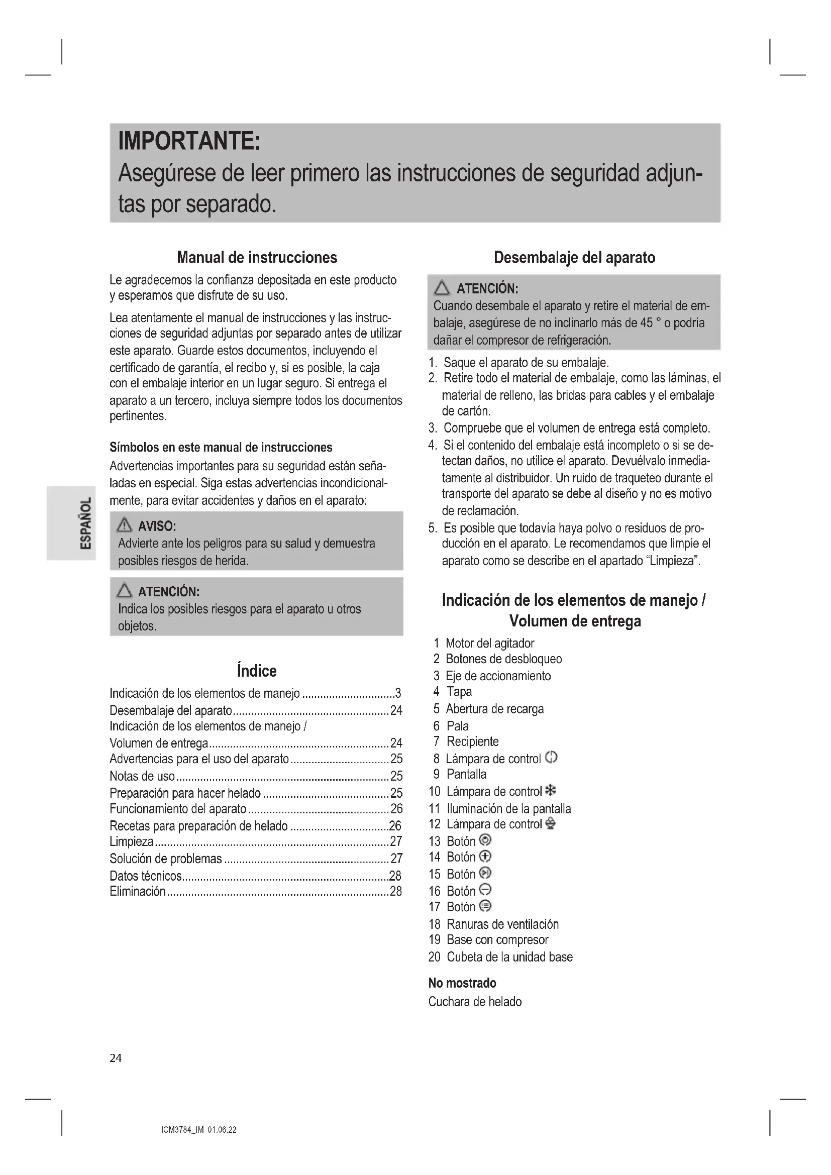 ducción en el aparato. Le recomendamos que limpie el aparato como se describe en el apartado “Limpieza”. Indicación de los elementos de manejo / Volumen de entrega 1 Motor del agitador 2 Botones de desbloqueo 3 Eje de accionamiento 4 Tapa 5 Abertura de recarga 6 Pala 7 Recipiente 8 Lámpara de control 9 Pantalla 10 Lámpara de control 11 Iluminación de la pantalla 12 Lámpara de control 13 Botón 14 Botón 15 Botón 16 Botón 17 Botón 18 Ranuras de ventilación 19 Base con compresor 20 Cubeta de la unidad base No mostrado Cuchara de heladoICM3784_IM 01.06.22
