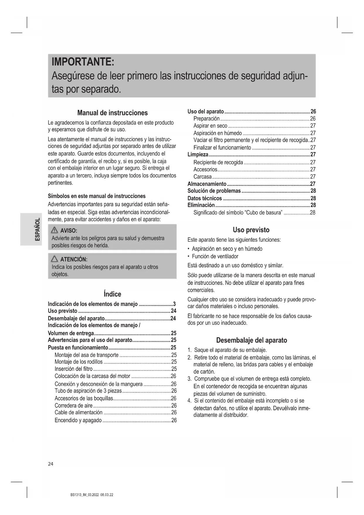 Lea atentamente el manual de instrucciones y las instrucciones de seguridad adjuntas por分开ar antes de utiliser este aparato. Guarde these documents, incluyendo el certificado de garantía, el recibo y, si es possible, la caja con el embalaje interior en un lugar seguro. Si entrega el aparato a un tercero, incluya siempre todos los documents pertinentes.