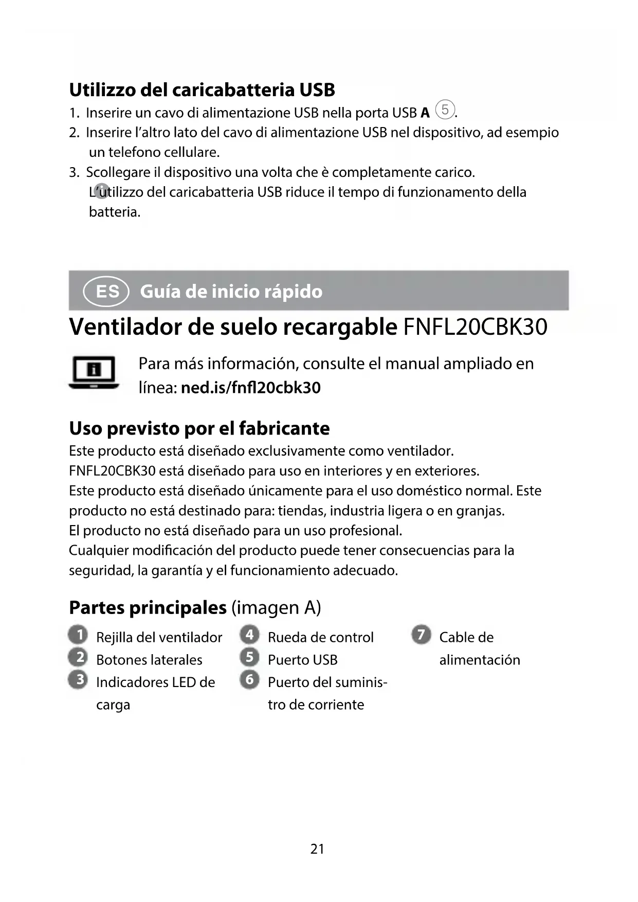 Guía de inicio rápido Ventilador de suelo recargable FNFL20CBK30 Para más información, consulte el manual ampliado en línea: ned.is/fn20cbk30 Uso previsto por el fabricante Este producto está diseñado exclusivamente como ventilador.FNFL20CBK30 está diseñado para uso en interiores y en exteriores.Este producto está diseñado únicamente para el uso doméstico normal. Este producto no está destinado para: tiendas, industria ligera o en granjas.El producto no está diseñado para un uso profesional.Cualquier modicación del producto puede tener consecuencias para la seguridad, la garantía y el funcionamiento adecuado. Partes principales (imagen A)