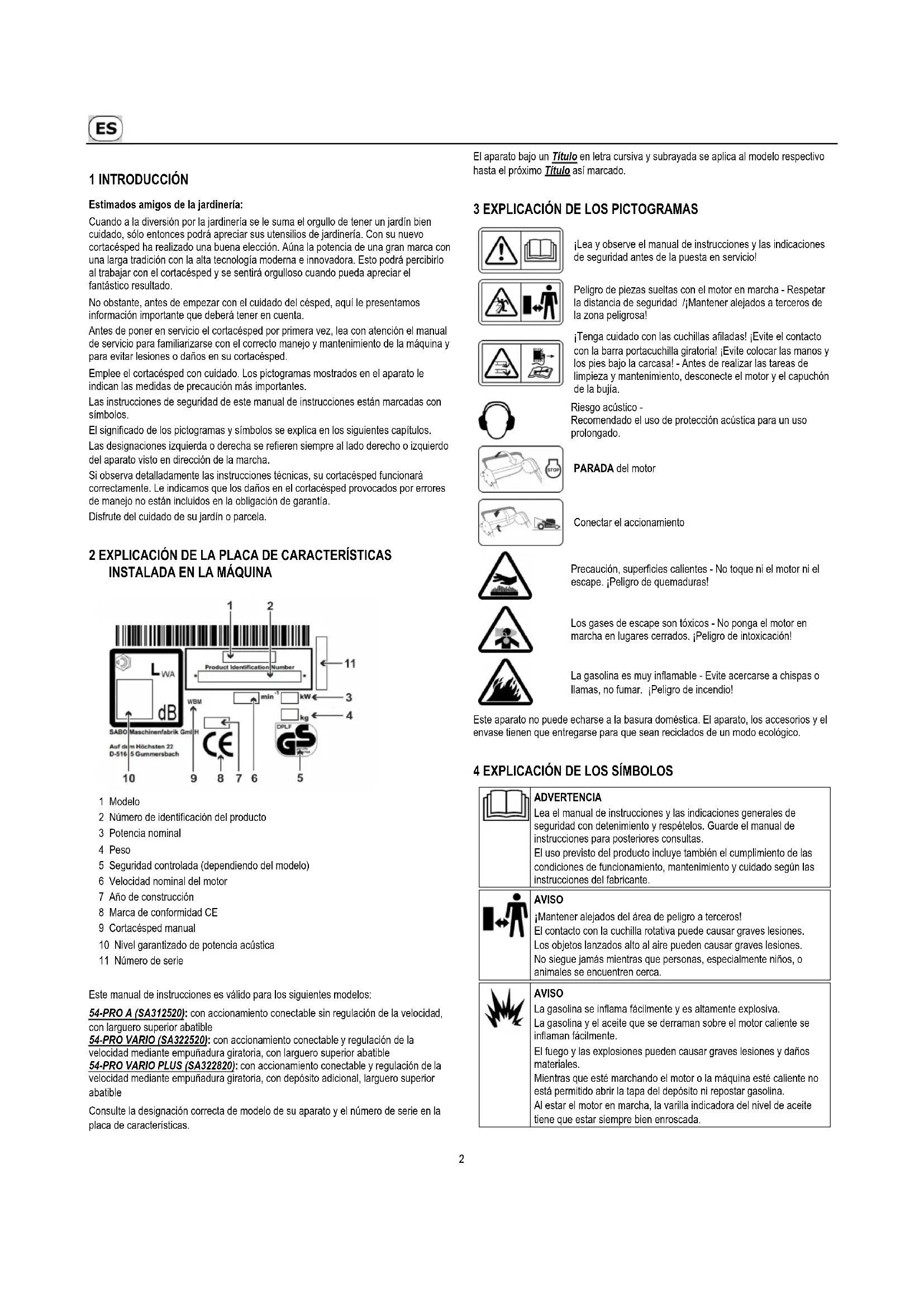 1 Modelo 2 Número de identificación del producto 3 Potencia nominal 4 Peso 5 Seguridad controlada (dependiendo del modelo) 6 Velocidad nominal del motor 7 Año de construcción 8 Marca de conformidad CE 9 Cortacésped manual 10 Nivel garantizado de potencia acústica 11 Número de serie Este manual de instrucciones es válido para los siguientes modelos: 54-PRO A (SA312520): con accionamiento conectable sin regulación de la velocidad, con larguero superior abatible 54-PRO VARIO (SA322520): con accionamiento conectable y regulación de la velocidad mediante empuñadura giratoria, con larguero superior abatible 54-PRO VARIO PLUS (SA322820): con accionamiento conectable y regulación de la velocidad mediante empuñadura giratoria, con depósito adicional, larguero superior abatible Consulte la designación correcta de modelo de su aparato y el número de serie en la placa de características. El aparato bajo un Título en letra cursiva y subrayada se aplica al modelo respectivo hasta el próximo Título así marcado.