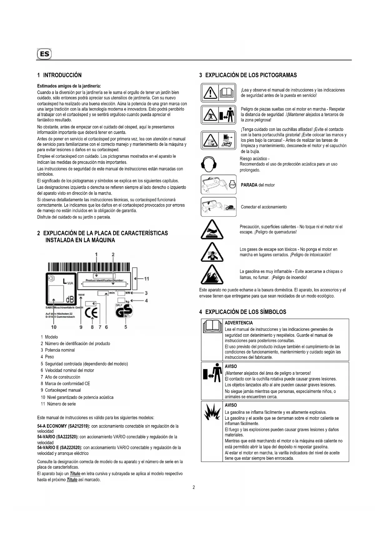Este manual de instrucciones es válido para los siguientes modelos: 54-A ECONOMY (SA212519): con accionamiento conectable sin regulación de la velocidad 54-VARIO (SA222520): con accionamiento VARIO conectable y regulación de la velocidad 54-VARIO E (SA222620): con accionamiento VARIO conectable y regulación de la velocidad y arranque eléctrico Consulte la designación correcta de modelo de su aparato y el número de serie en la placa de características. El aparato bajo un Título en letra cursiva y subrayada se aplica al modelo respectivo hasta el próximo Título así marcado.