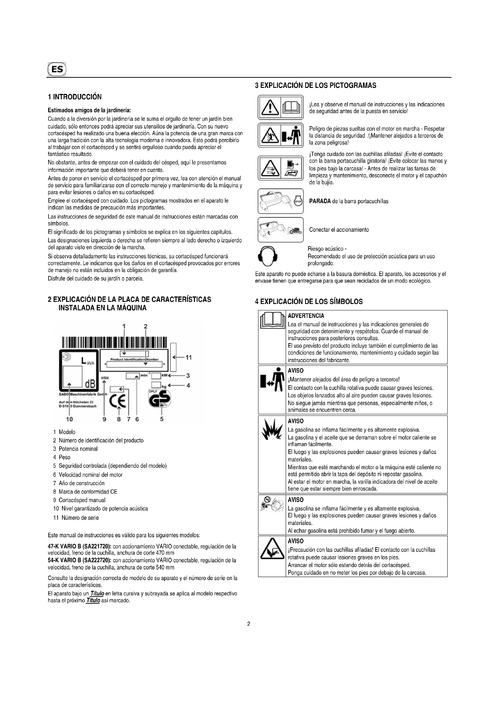 1 Modelo 2 Número de identificación del producto 3 Potencia nominal 4 Peso 5 Seguridad controlada (dependiendo del modelo) 6 Velocidad nominal del motor 7 Año de construcción 8 Marca de conformidad CE 9 Cortacésped manual 10 Nivel garantizado de potencia acústica 11 Número de serie Este manual de instrucciones es válido para los siguientes modelos: 47-K VARIO B (SA221720): con accionamiento VARIO conectable, regulación de la velocidad, freno de la cuchilla, anchura de corte 470 mm 54-K VARIO B (SA222720): con accionamiento VARIO conectable, regulación de la velocidad, freno de la cuchilla, anchura de corte 540 mm Consulte la designación correcta de modelo de su aparato y el número de serie en la placa de características. El aparato bajo un Título en letra cursiva y subrayada se aplica al modelo respectivo hasta el próximo Título así marcado.
