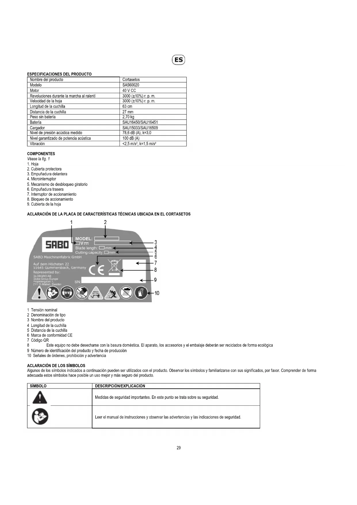 Fabricante: SABO Maschinenfabrik GmbH Dirección: Auf dem Höchsten 22, 51645 Gummersbach, Alemania Representado por: GLOBGRO AB, Globe Group Europe Propellergatan 1, 211 15 Malmö, Suecia 11421 Nombre y dirección de la persona autorizada para compilar el expediente técnico: Nombre: Peter Söderström Dirección: Propellergatan 1, 211 15 Malmö, Suecia 11421 Por la presente declaramos que el product Categoría: Cortasetas inalámbrico 40 V Modelo: SA560020 Número de serie: Ver etiqueta de clasificación de productos Año de fabricación: Ver etiqueta de clasificación de productos