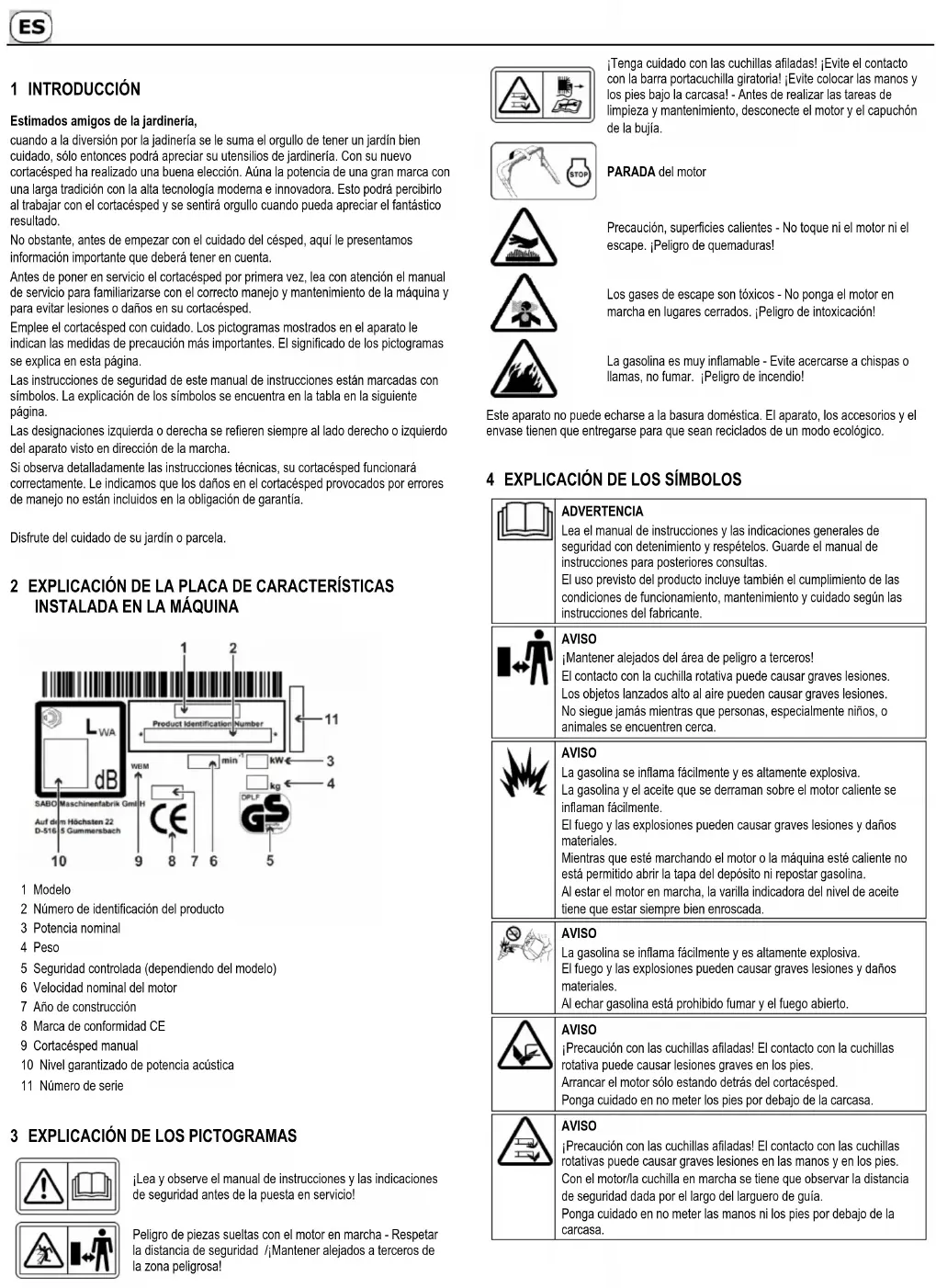 1 INTRODUCCIÓN Estimados amigos de la jardinería, cuando a la diversión por la jadinería se le suma el orgullo de tener un jardín bien cuidado, sólo entonces podrá apreciar su utensilios de jardinería. Con su nuevo cortacésped ha realizado una buena elección. Aúna la potencia de una gran marca con una larga tradición con la alta tecnología moderna e innovadora. Esto podrá percibirlo al trabajar con el cortacésped y se sentirá orgullo cuando pueda apreciar el fantástico resultado. No obstante, antes de empezar con el cuidado del césped, aquí le presentamos información importante que deberá tener en cuenta. Antes de poner en servicio el cortacésped por primera vez, lea con atención el manual de servicio para familiarizarse con el correcto manejo y mantenimiento de la máquina y para evitar lesiones o daños en su cortacésped. Emplee el cortacésped con cuidado. Los pictogramas mostrados en el aparato le indican las medidas de precaución más importantes. El significado de los pictogramas se explica en esta página. Las instrucciones de seguridad de este manual de instrucciones están marcadas con símbolos. La explicación de los símbolos se encuentra en la tabla en la siguiente página. Las designaciones izquierda o derecha se refieren siempre al lado derecho o izquierdo del aparato visto en dirección de la marcha. Si observa detalladamente las instrucciones técnicas, su cortacésped funcionará correctamente. Le indicamos que los daños en el cortacésped provocados por errores de manejo no están incluidos en la obligación de garantía. Disfrute del cuidado de su jardín o parcela.