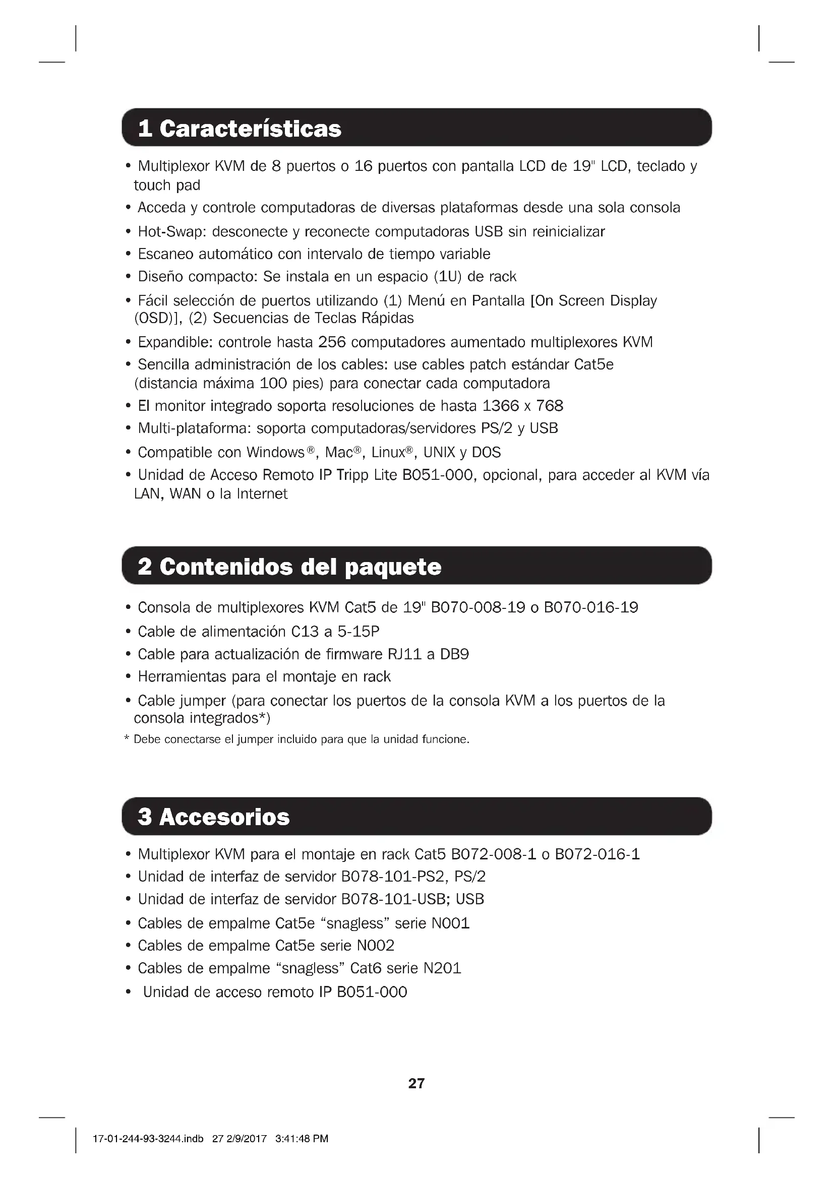 - Unidad de Acceso Remoto IP Tripp Lite B051-000, optional, para acceder al KVM via LAN, WAN o la Internet