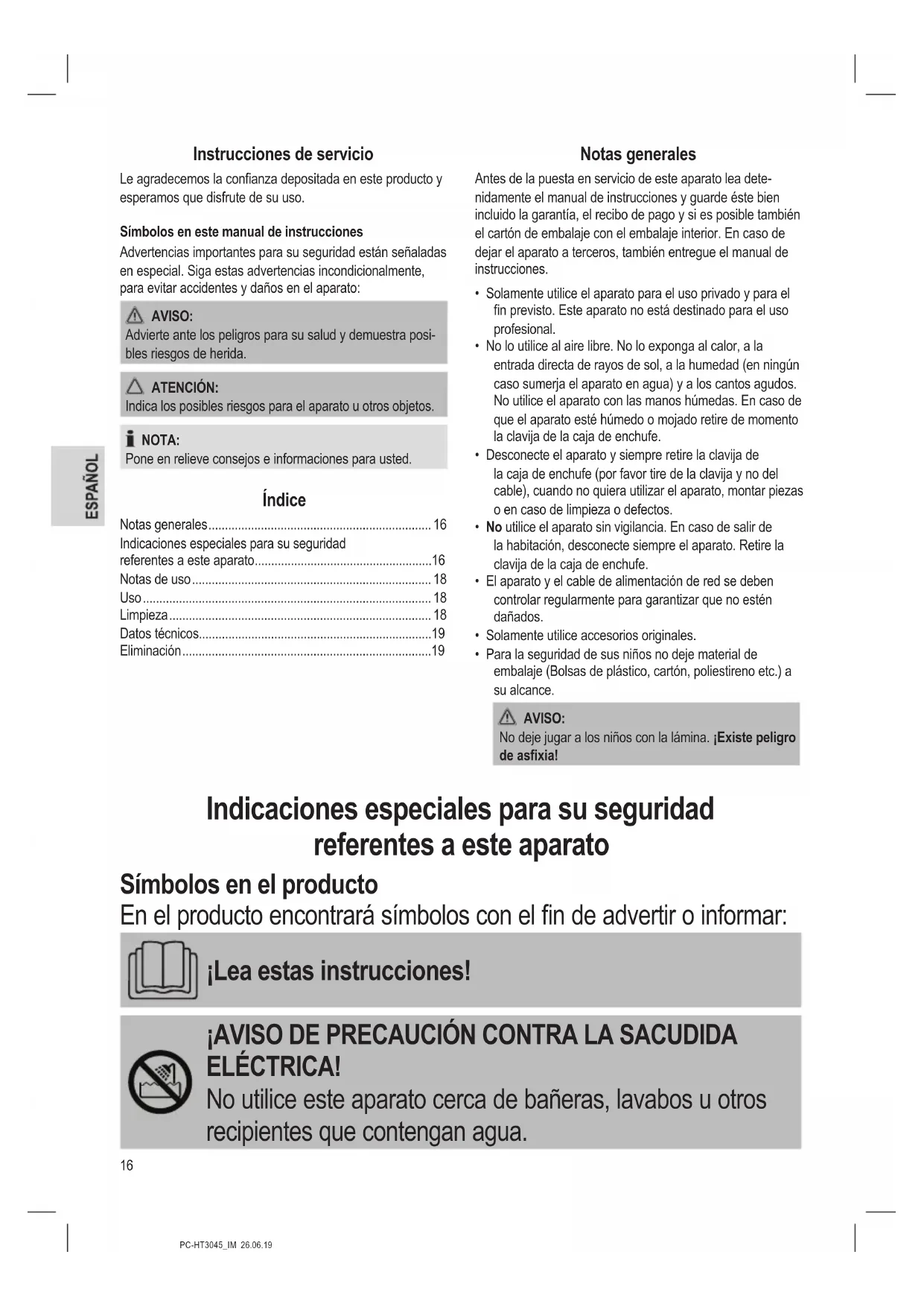 - Para la seguridad de sus niños no deje material de embalaje (Bolsas de plástico, cartón, poliestireno etc.) a su alcance. AVISO: No deje jugar a los niños con la lámina. ¡Existe peligro de asxia! Indicaciones especiales para su seguridad referentes a este aparato Símbolos en el producto En el producto encontrará símbolos con el n de advertir o informar: ¡Lea estas instrucciones! ¡AVISO DE PRECAUCIÓN CONTRA LA SACUDIDA ELÉCTRICA! No utilice este aparato cerca de bañeras, lavabos u otros recipientes que contengan agua.17 PC-HT3045_IM 26.06.19 AVISO: