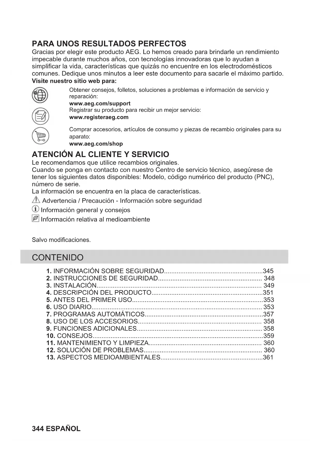 Gracias por elegir este producto AEG. Lo hemos creado para brindarle un rendimiento impecable durante muchos años, con tecnologías innovadoras que lo ayudan a simplificar la vida, características que quizás no encuentre en los electrodomésticos comunes. Dedique unos minutos a leer este documento para sacarle el máximo partido. Visite nuestro sitio web para: Obtener consejos, folletos, soluciones a problemas e información de servicio yreparación:www.aeg.com/supportRegistrar su producto para recibir un mejor servicio:www.registeraeg.comComprar accesorios, artículos de consumo y piezas de recambio originales para suaparato:www.aeg.com/shop