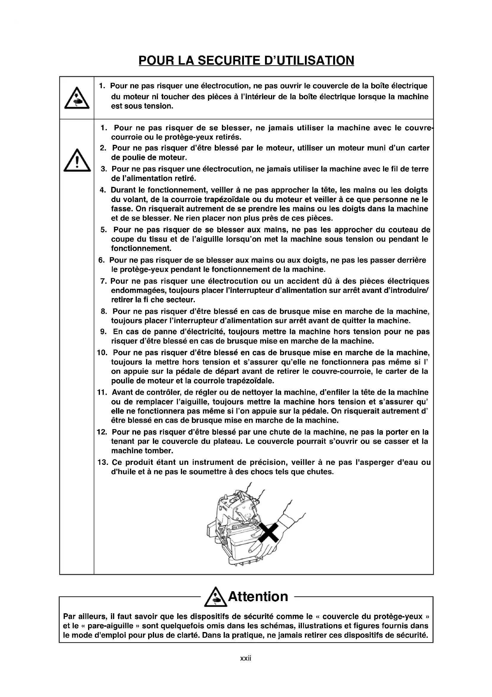 d'huile et à ne pas le soumettre à des chocs tels que chutes. Par ailleurs, il faut savoir que les dispositifs de sécurité comme le « couvercle du protège-yeux » et le « pare-aiguille » sont quelquefois omis dans les schémas, illustrations et fi gures fournis dans le mode d'emploi pour plus de clarté. Dans la pratique, ne jamais retirer ces dispositifs de sécurité. Attentionxxiii En relación con el uso de la máquina de coser, máquina automática y dispositivos auxiliares (de aquí en adelante denominados colectivamente como la ³máquina´), es inevitable que el trabaMo de cosido tenga que eMecutarse cerca de partes móviles de la máquina. Esto signi¿ca que siempre existe la posibilidad de que se toquen piezas móviles involuntariamente. Por lo tanto, a los operadores u operadoras que mane- Man la máquina y al personal de mantenimiento que eMecuta trabaMos de mantenimiento y reparación de la máquina, se les recomienda leer detenidamente las siguientes PRECAUCIONES DE SEGURIDAD y te- ner un cabal conocimiento de las mismas antes de usar/efectuar el mantenimiento de la máquina. Estas