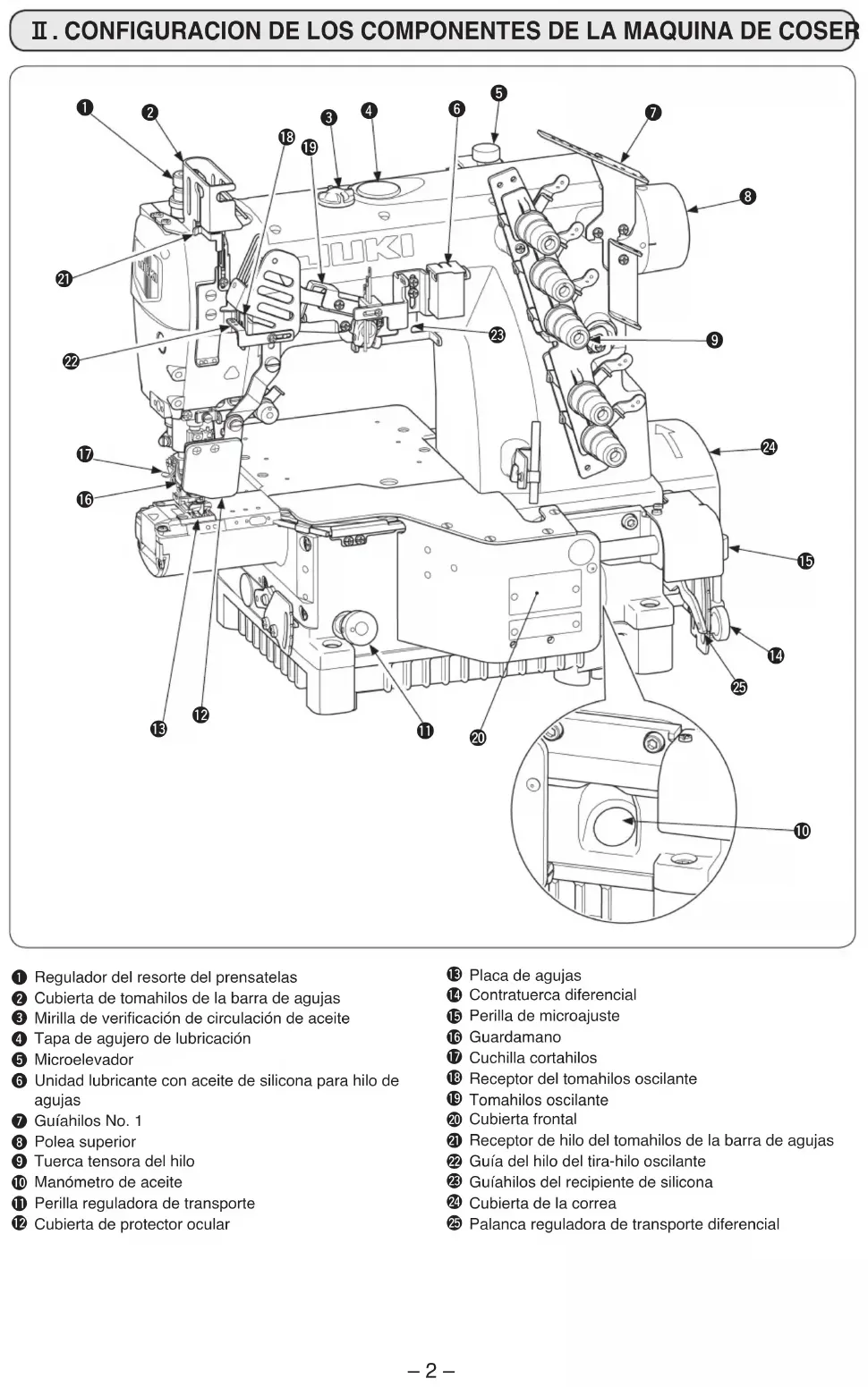 CONFIGURACION DE LOS COMPONENTES DE LA MAQUINA DE COSER 1Regulador del resorte del prensatelas2Cubierta de tomahilos de la barra de agujas3 Mirilla de vericación de circulación de aceite 4Tapa de agujero de lubricación5Microelevador6Un idad lubricante con aceite de silicona para hilo de agujas7Guíahilos No. 18Polea superior9Tuerca tensora del hilo!0Manómetro de aceite!1Perilla reguladora de transporte!2Cubierta de protector ocular!3Placa de agujas!4Contratuerca diferencial!5Perilla de microajuste!6Guardamano!7Cuchilla cortahilos!8Receptor del tomahilos oscilante!9Tomahilos oscilante @0Cubierta frontal@1Receptor de hilo del tomahilos de la barra de agujas@2Guía del hilo del tira-hilo oscilante@3Guíahilos del recipiente de silicona@4Cubierta de la correa@5Palanca reguladora de transporte diferencial123456789!0!1!2!3!4!5!6!7!8!9@4@0@2@1@3@5