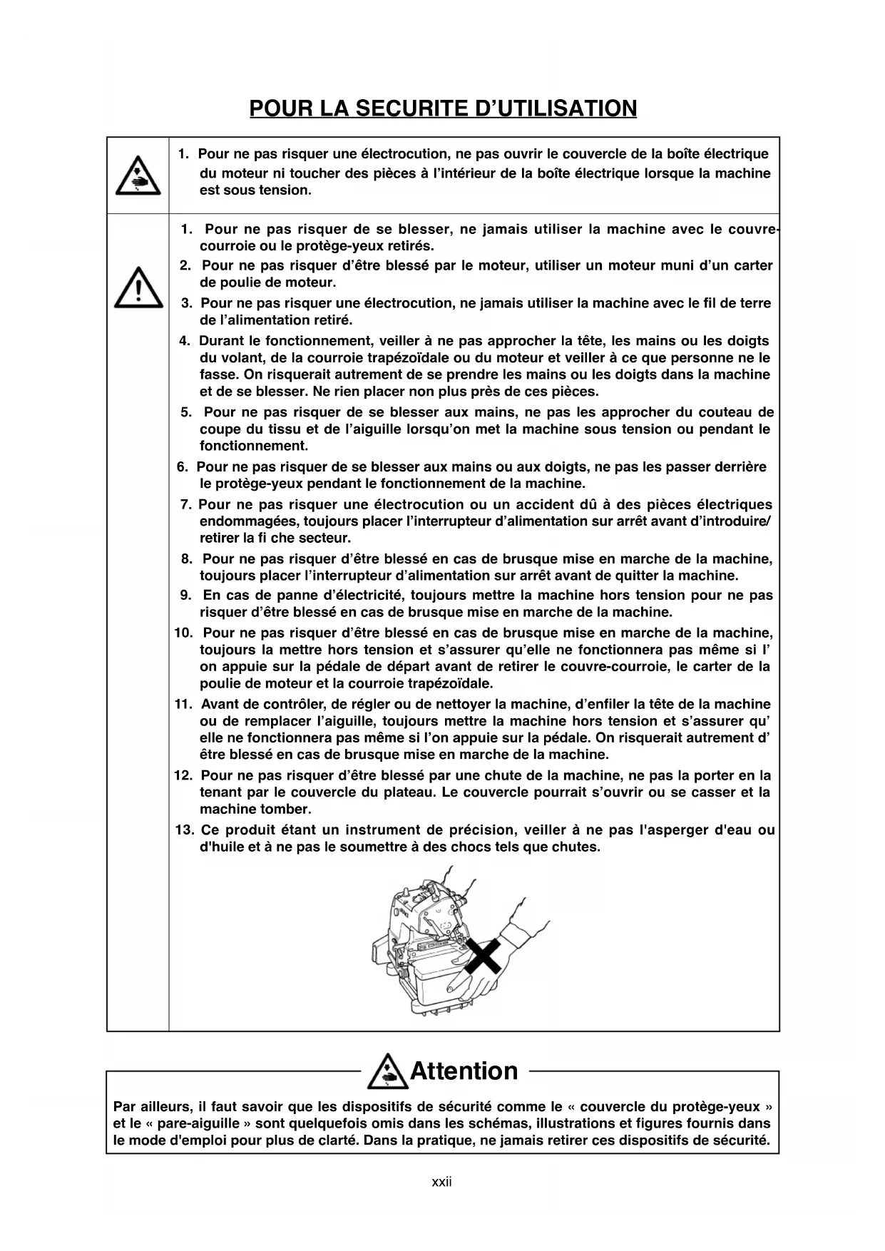 d'huile et à ne pas le soumettre à des chocs tels que chutes. Par ailleurs, il faut savoir que les dispositifs de sécurité comme le « couvercle du protège-yeux » et le « pare-aiguille » sont quelquefois omis dans les schémas, illustrations et fi gures fournis dans le mode d'emploi pour plus de clarté. Dans la pratique, ne jamais retirer ces dispositifs de sécurité. Attentionxxiii En relación con el uso de la máquina de coser, máquina automática y dispositivos auxiliares (de aquí en adelante denominados colectivamente como la ³máquina´), es inevitable que el trabaMo de cosido tenga que eMecutarse cerca de partes móviles de la máquina. Esto signi¿ca que siempre existe la posibilidad de que se toquen piezas móviles involuntariamente. Por lo tanto, a los operadores u operadoras que mane- Man la máquina y al personal de mantenimiento que eMecuta trabaMos de mantenimiento y reparación de la máquina, se les recomienda leer detenidamente las siguientes PRECAUCIONES DE SEGURIDAD y te- ner un cabal conocimiento de las mismas antes de usar/efectuar el mantenimiento de la máquina. Estas