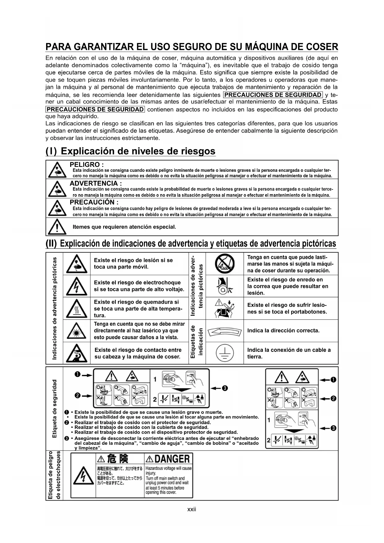 PARA GARANTIZAR EL USO SEGURO DE SU MÁQUINA DE COSER (I) E[Slicaciyn de niveles de riesgos (II) E[Slicaciyn de indicaciones de advertencia \ etiTuetas de advertencia Sictyricasxxiii