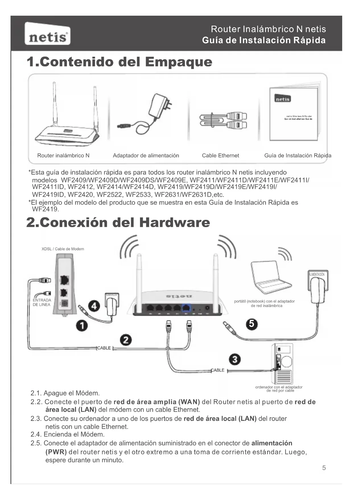2.Conexión del Hardware 2.1. Apague el Módem. 2.2. Conecte el puerto de red de área amplia (WAN) del Router netis al puerto de red de área local (LAN) del módem con un cable Ethernet. 2.3. Conecte su ordenador a uno de los puertos de red de área local (LAN) del router netis con un cable Ethernet. 2.4. Encienda el Módem. 2.5. Conecte el adaptador de alimentación suministrado en el conector de alimentación (PWR) del router netis y el otro extremo a una toma de corriente estándar. Luego, espere durante un minuto. CABLECABLEENTRADA DE LINEAALIMENTACIÓNXDSL / Cable de Modemportátil (notebook) con el adaptador de red inalámbrica ALIMENTACIÓN *Esta guía de instalación rápida es para todos los router inalámbrico N netis incluyendo modelos WF2409/WF2409D/WF2409DS/WF2409E, WF2411/WF2411D/WF2411E/WF2411I/ WF2411ID, WF2412, WF2414/WF2414D, WF2419/WF2419D/WF2419E/WF2419I/ WF2419ID, WF2420, WF2522, WF2533, WF2631/WF2631D,etc. *El ejemplo del modelo del producto que se muestra en esta Guía de Instalación Rápida es WF2419. ordenador con el adaptador de red por cable