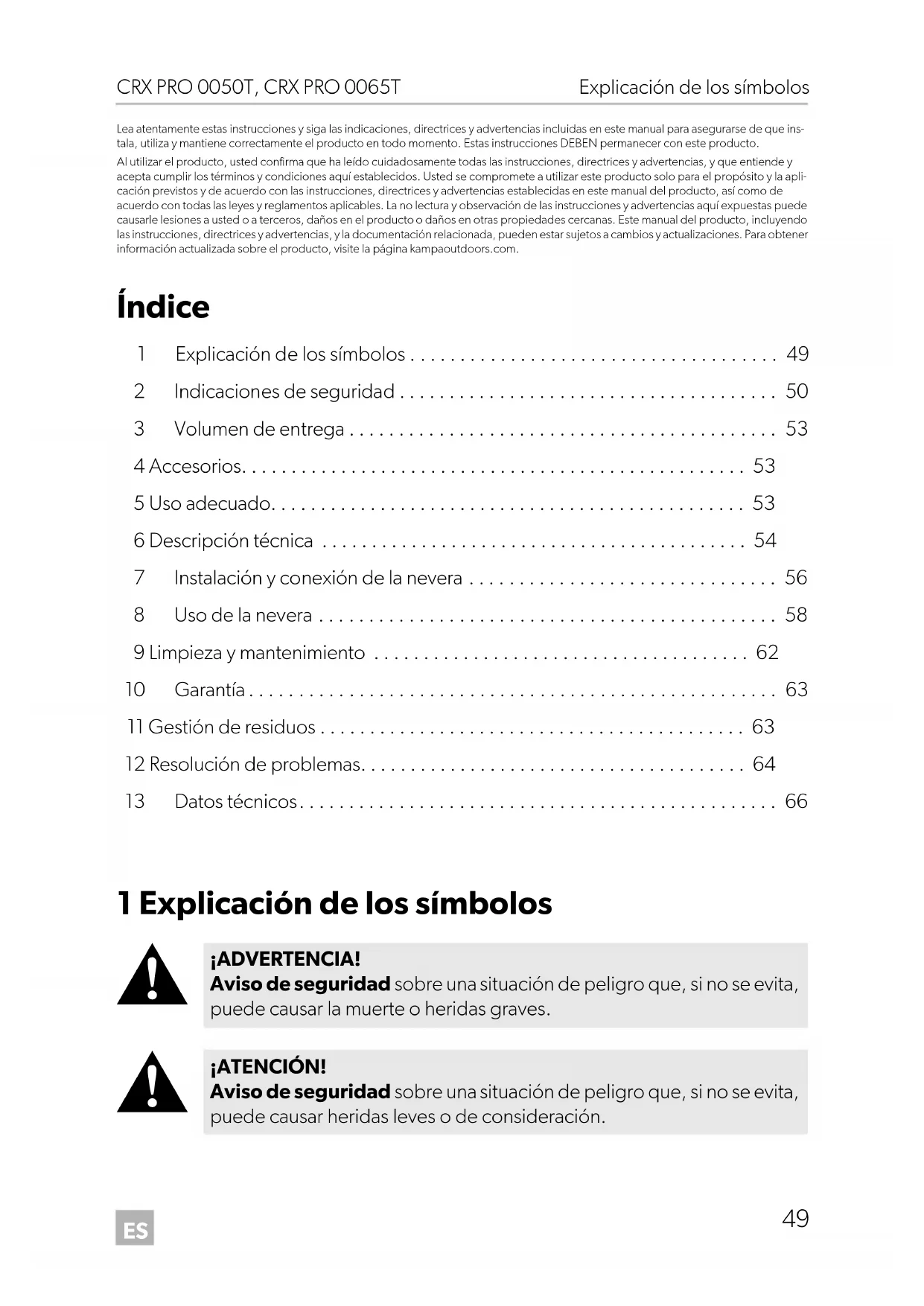 - Lea atentamente estas instrucciones y siga las indicaciones, directrices y advertencias incluidas en este manual para asegurarse de que ins- tala, utiliza y mantiene correctamente el producto en todo momento. Estas instrucciones DEBEN permanecer con este producto. Al utilizar el producto, usted confirma que ha leído cuidadosamente todas las instrucciones, directrices y advertencias, y que entiende y acepta cumplir los términos y condiciones aquí establecidos. Usted se compromete a utilizar este producto solo para el propósito y la apli- cación previstos y de acuerdo con las instrucciones, directrices y advertencias establecidas en este manual del producto, así como de acuerdo con todas las leyes y reglamentos aplicables. La no lectura y observación de las instrucciones y advertencias aquí expuestas puede causarle lesiones a usted o a terceros, daños en el producto o daños en otras propiedades cercanas. Este manual del producto, incluyendo las instrucciones, directrices y advertencias, y la documentación relacionada, pueden estar sujetos a cambios y actualizaciones. Para obtener información actualizada sobre el producto, visite la página kampaoutdoors.com. Índice 1 Explicación de los símbolos p. 49
