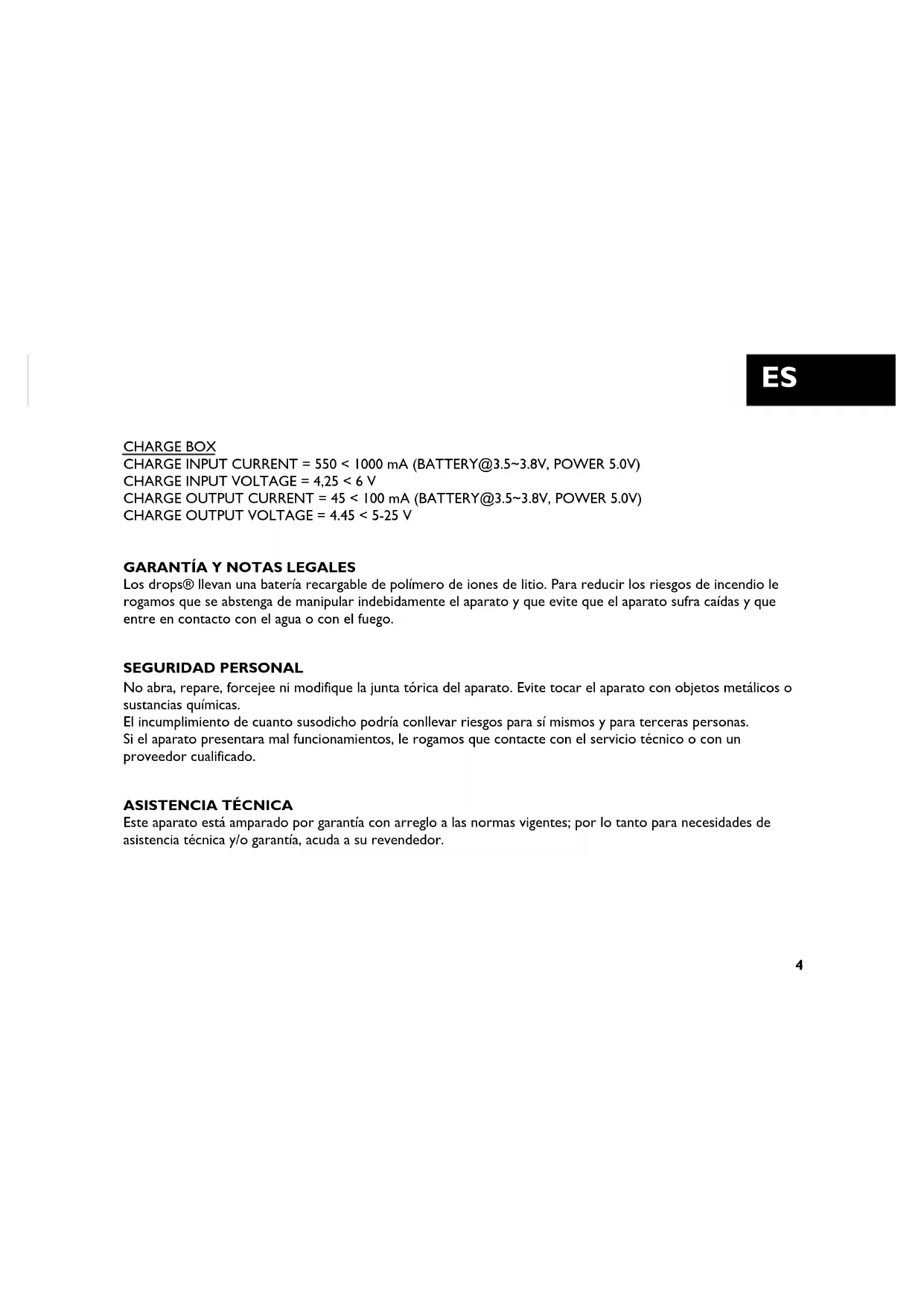 Los drops® llevan una batería recargable de polímero de iones de litio. Para reducir los riesgos de incendio le rogamos que se abstenga de manipular indebidamente el aparato y que evite que el aparato sufra caídas y que entre en contacto con el agua o con el fuego.