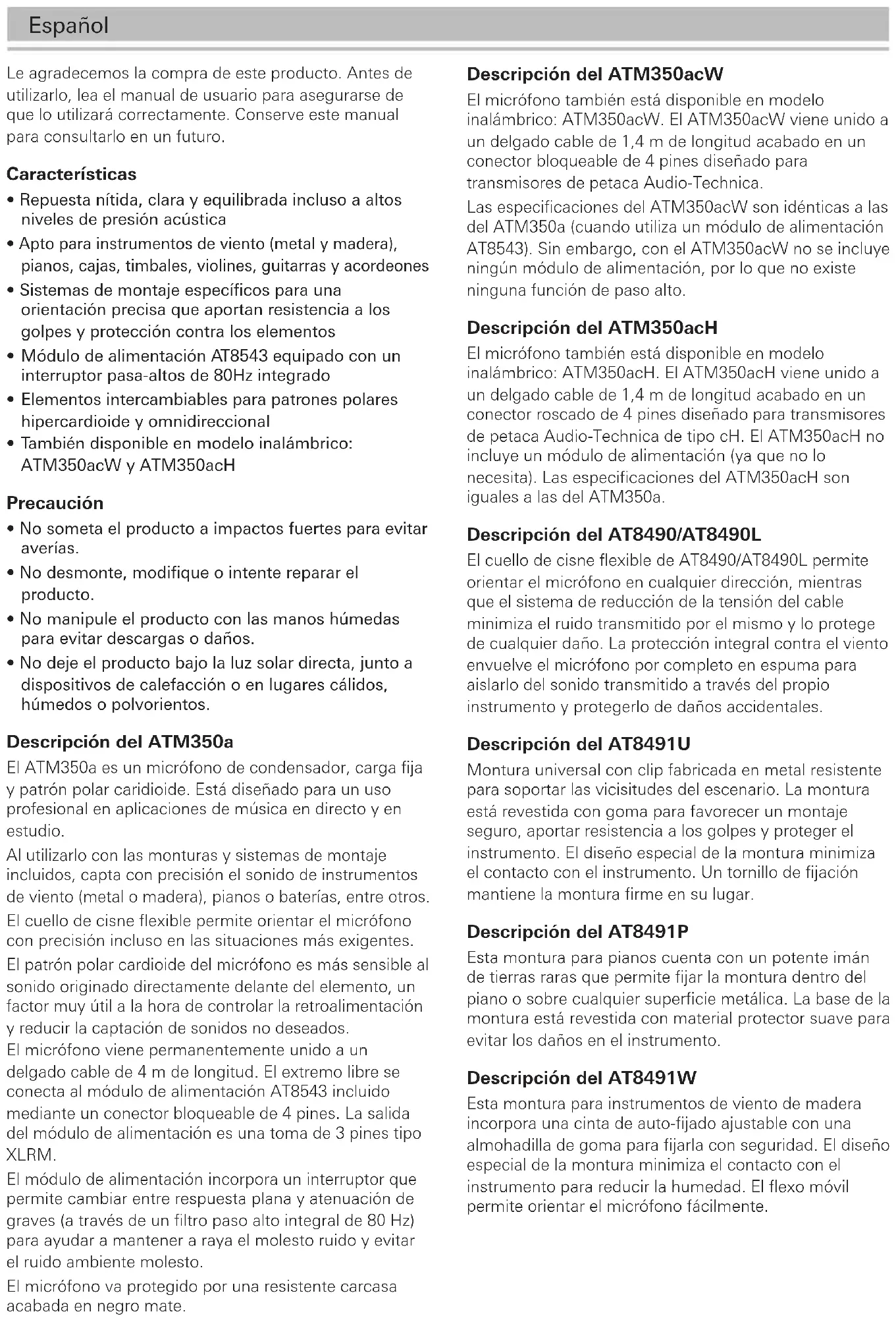 - Specifica misurata quando si è connessi al modulo di alimentazione AT8543. Frequenza in Hertz Risposta en dB 0°, 50 cm Attenuatore1 Español Descripción del ATM350acW El micrófono también está disponible en modelo inalámbrico: ATM350acW. El ATM350acW viene unido a un delgado cable de 1,4 m de longitud acabado en un conector bloqueable de 4 pines diseñado para transmisores de petaca Audio-Technica. Las especificaciones del ATM350acW son idénticas a las del ATM350a (cuando utiliza un módulo de alimentación AT8543). Sin embargo, con el ATM350acW no se incluye ningún módulo de alimentación, por lo que no existe ninguna función de paso alto. Descripción del ATM350acH El micrófono también está disponible en modelo inalámbrico: ATM350acH. El ATM350acH viene unido a un delgado cable de 1,4 m de longitud acabado en un conector roscado de 4 pines diseñado para transmisores de petaca Audio-Technica de tipo cH. El ATM350acH no incluye un módulo de alimentación (ya que no lo necesita). Las especificaciones del ATM350acH son iguales a las del ATM350a. Descripción del AT8490/AT8490L El cuello de cisne flexible de AT8490/AT8490L permite orientar el micrófono en cualquier dirección, mientras que el sistema de reducción de la tensión del cable minimiza el ruido transmitido por el mismo y lo protege de cualquier daño. La protección integral contra el viento envuelve el micrófono por completo en espuma para aislarlo del sonido transmitido a través del propio instrumento y protegerlo de daños accidentales. Descripción del AT8491U Montura universal con clip fabricada en metal resistente para soportar las vicisitudes del escenario. La montura está revestida con goma para favorecer un montaje seguro, aportar resistencia a los golpes y proteger el instrumento. El diseño especial de la montura minimiza el contacto con el instrumento. Un tornillo de fijación mantiene la montura firme en su lugar. Descripción del AT8491P Esta montura para pianos cuenta con un potente imán de tierras raras que permite fijar la montura dentro del piano o sobre cualquier superficie metálica. La base de la montura está revestida con material protector suave para evitar los daños en el instrumento. Descripción del AT8491W Esta montura para instrumentos de viento de madera incorpora una cinta de auto-fijado ajustable con una almohadilla de goma para fijarla con seguridad. El diseño especial de la montura minimiza el contacto con el instrumento para reducir la humedad. El flexo móvil permite orientar el micrófono fácilmente. Le agradecemos la compra de este producto. Antes de utilizarlo, lea el manual de usuario para asegurarse de que lo utilizará correctamente. Conserve este manual para consultarlo en un futuro. Características