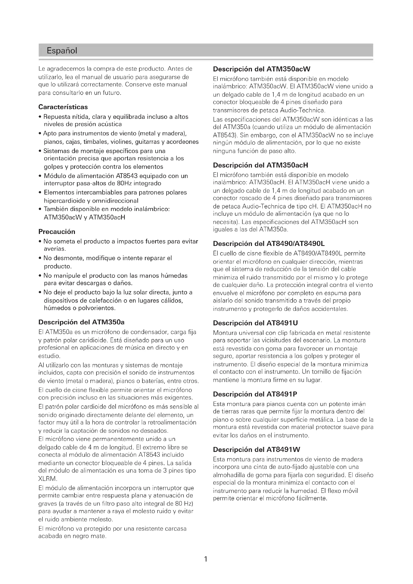 - Specifica misurata quando si è connessi al modulo di alimentazione AT8543. Frequenza in Hertz Risposta en dB 0°, 50 cm Attenuatore1 Español Descripción del ATM350acW El micrófono también está disponible en modelo inalámbrico: ATM350acW. El ATM350acW viene unido a un delgado cable de 1,4 m de longitud acabado en un conector bloqueable de 4 pines diseñado para transmisores de petaca Audio-Technica. Las especificaciones del ATM350acW son idénticas a las del ATM350a (cuando utiliza un módulo de alimentación AT8543). Sin embargo, con el ATM350acW no se incluye ningún módulo de alimentación, por lo que no existe ninguna función de paso alto. Descripción del ATM350acH El micrófono también está disponible en modelo inalámbrico: ATM350acH. El ATM350acH viene unido a un delgado cable de 1,4 m de longitud acabado en un conector roscado de 4 pines diseñado para transmisores de petaca Audio-Technica de tipo cH. El ATM350acH no incluye un módulo de alimentación (ya que no lo necesita). Las especificaciones del ATM350acH son iguales a las del ATM350a. Descripción del AT8490/AT8490L El cuello de cisne flexible de AT8490/AT8490L permite orientar el micrófono en cualquier dirección, mientras que el sistema de reducción de la tensión del cable minimiza el ruido transmitido por el mismo y lo protege de cualquier daño. La protección integral contra el viento envuelve el micrófono por completo en espuma para aislarlo del sonido transmitido a través del propio instrumento y protegerlo de daños accidentales. Descripción del AT8491U Montura universal con clip fabricada en metal resistente para soportar las vicisitudes del escenario. La montura está revestida con goma para favorecer un montaje seguro, aportar resistencia a los golpes y proteger el instrumento. El diseño especial de la montura minimiza el contacto con el instrumento. Un tornillo de fijación mantiene la montura firme en su lugar. Descripción del AT8491P Esta montura para pianos cuenta con un potente imán de tierras raras que permite fijar la montura dentro del piano o sobre cualquier superficie metálica. La base de la montura está revestida con material protector suave para evitar los daños en el instrumento. Descripción del AT8491W Esta montura para instrumentos de viento de madera incorpora una cinta de auto-fijado ajustable con una almohadilla de goma para fijarla con seguridad. El diseño especial de la montura minimiza el contacto con el instrumento para reducir la humedad. El flexo móvil permite orientar el micrófono fácilmente. Le agradecemos la compra de este producto. Antes de utilizarlo, lea el manual de usuario para asegurarse de que lo utilizará correctamente. Conserve este manual para consultarlo en un futuro. Características