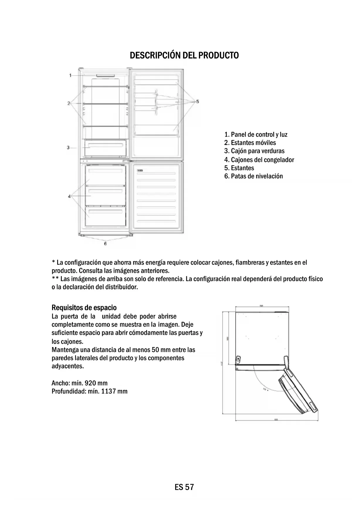 - La configuración que ahorra más energía requiere colocar cajones, fiambreras y estantes en el producto. Consulta las imágenes anteriores. ** Las imágenes de arriba son solo de referencia. La configuración real dependerá del producto físico o la declaración del distribuidor. Requisitos de espacio La puerta de la unidad debe poder abrirse completamente como se muestra en la imagen. Deje suficiente espacio para abrir cómodamente las puertas y los cajones. Mantenga una distancia de al menos 50 mm entre las paredes laterales del producto y los componentes adyacentes. Ancho: mín. 920 mm Profundidad: mín. 1137 mmES 58 USO ➀ Tecla de ENCENDIDO/APAGADO, utilizada para encender y apagar el electrodoméstico. ➁ Tecla Mode, utilizada para seleccionar la temperatura del frigorífico o las funciones especiales. ➂ Icono Wi-Fi, indica si el electrodoméstico está conectado a la aplicación. ➃ Icono Súper Fresco muestra si la función está activada. ➄ Niveles de temperatura, muestran la temperatura seleccionada. Uso