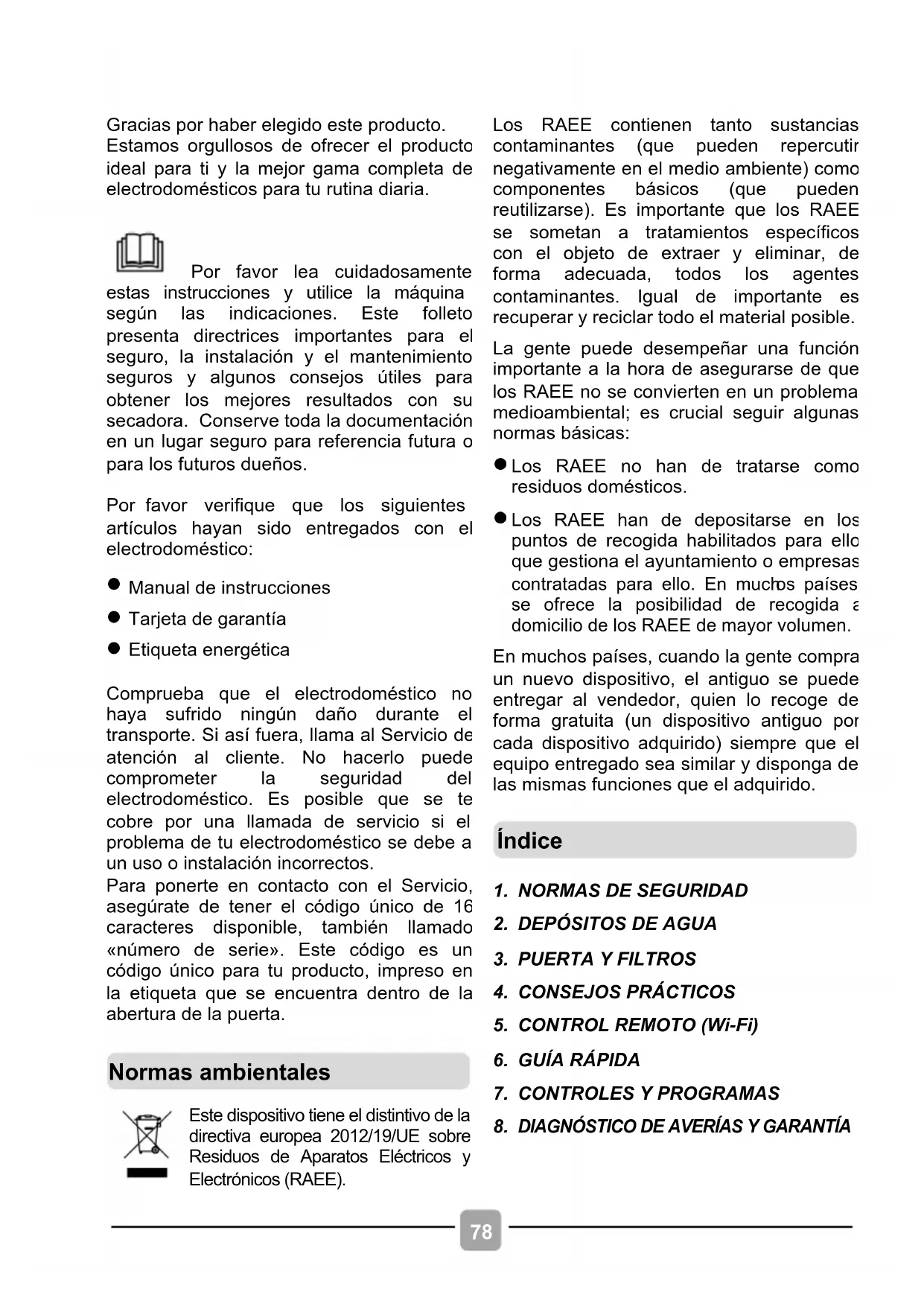Al mostrar el logo marcado en este producto, declaramos, bajo nuestra propia responsabilidad, el cumplimiento de todos los requisitos europeos en términos de seguridad, salud y medio ambiente, establecidos en la legislación de este producto. Por razones de seguridad cuando se deseche una secadora, desenchufe el cable eléctrico de la toma general, corte el cable y destrúyalo junto con el enchufe. Para evitar que los niños se queden encerrados en la máquina, rompa las bisagras o la cerradura de la puerta. El fabricante no se responsabiliza por eventuales erratas de imprenta contenidas en el presente manual de instrucciones. Asimismo, se reserva el derecho de efectuar las modificaciones que considere oportunas para sus productos sin comprometer sus características fundamentales.