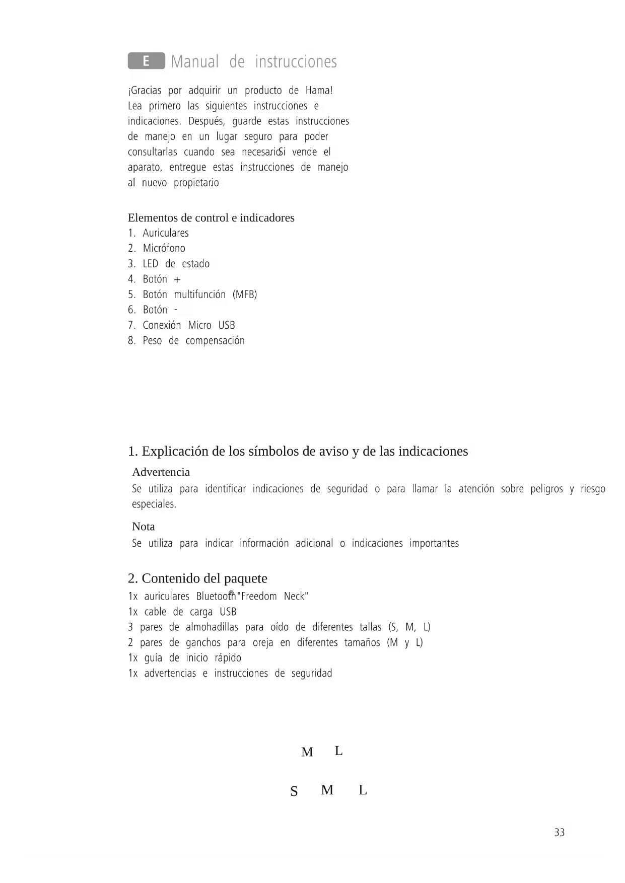 "Freedom Neck" 1x cable de carga USB 3 pares de almohadillas para oído de diferentes tallas (S, M, L) 2 pares de ganchos para oreja en diferentes tamaños (M y L) 1x guía de inicio rápido 1x advertencias e instrucciones de seguridad