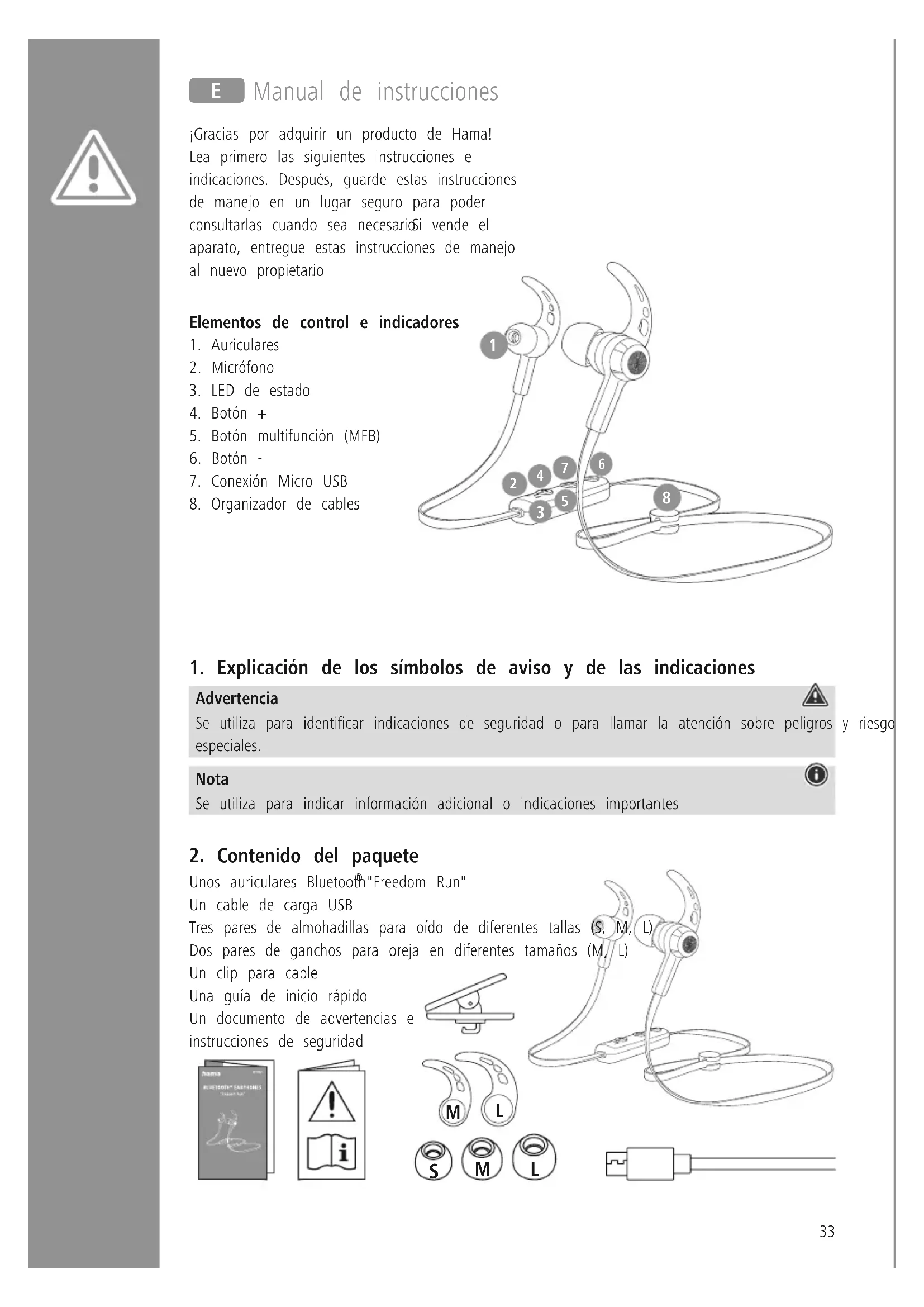 Le soussigné, Hama GmbH & Co KG, déclare que l’équipement radioélectrique du type [00184121] est conforme à la directive 2014/53/UE Le texte complet de la déclaration UE de conformité est disponible à l’adresse internet suivante : www hamacom->00184121->Downloads Bandes de fréquences 2402MHz – 2480MHz Puissance d’émission émise maximale 25mW EIRP33 E Manual de instrucciones ¡Gracias por adquirir un producto de Hama! Lea primero las siguientes instrucciones e indicaciones Después, guarde estas instrucciones de manejo en un lugar seguro para poder consultarlas cuando sea necesario Si vende el aparato, entregue estas instrucciones de manejo al nuevo propietario
