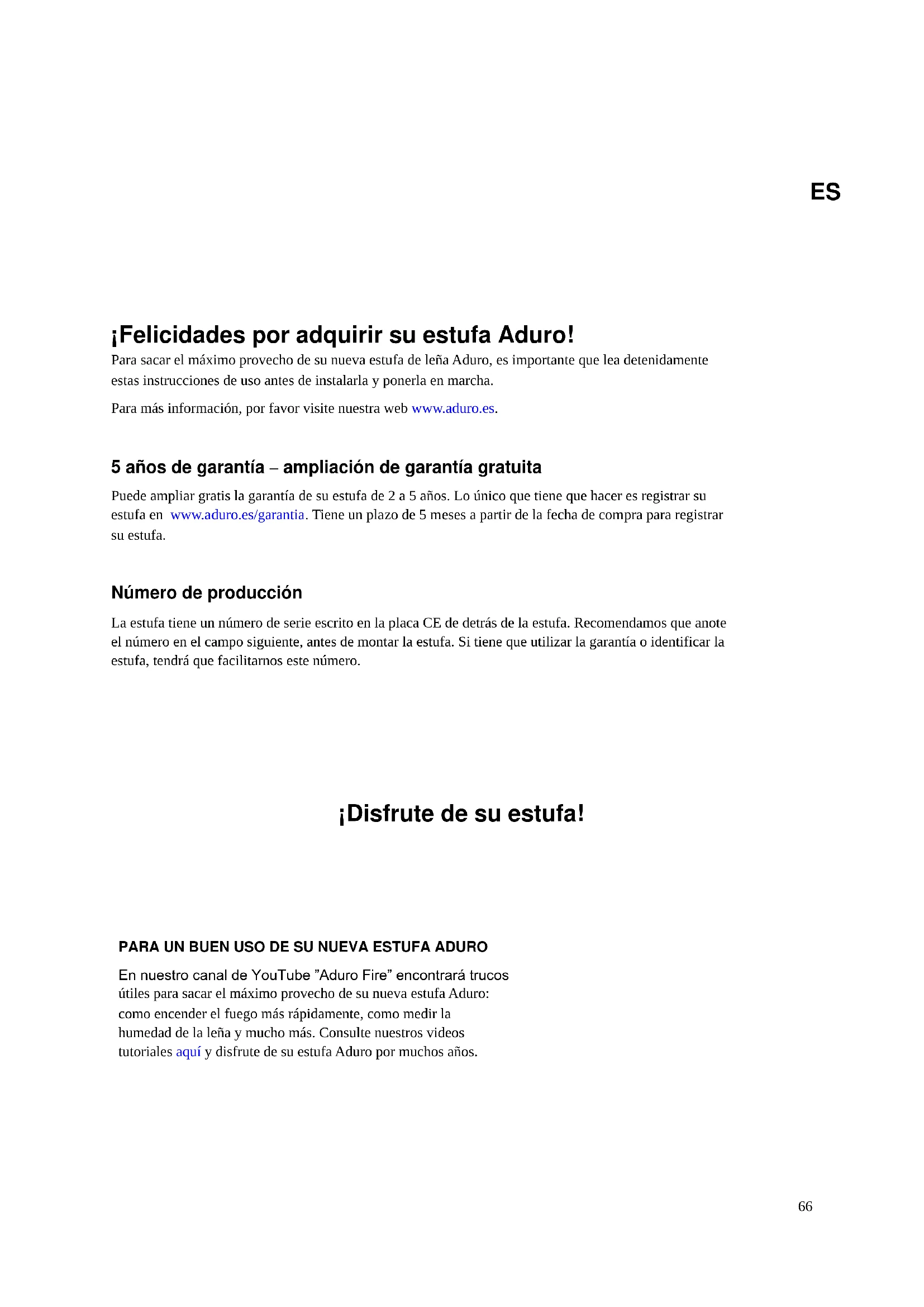 Puede ampliar gratis la garantía de su estufa de 2 a 5 años. Lo único que tiene que hacer es registrar su estufa en www.aduro.es/garantia. Tiene un plazo de 5 días a partir de la Fecha de compra para registrar su estufa.
