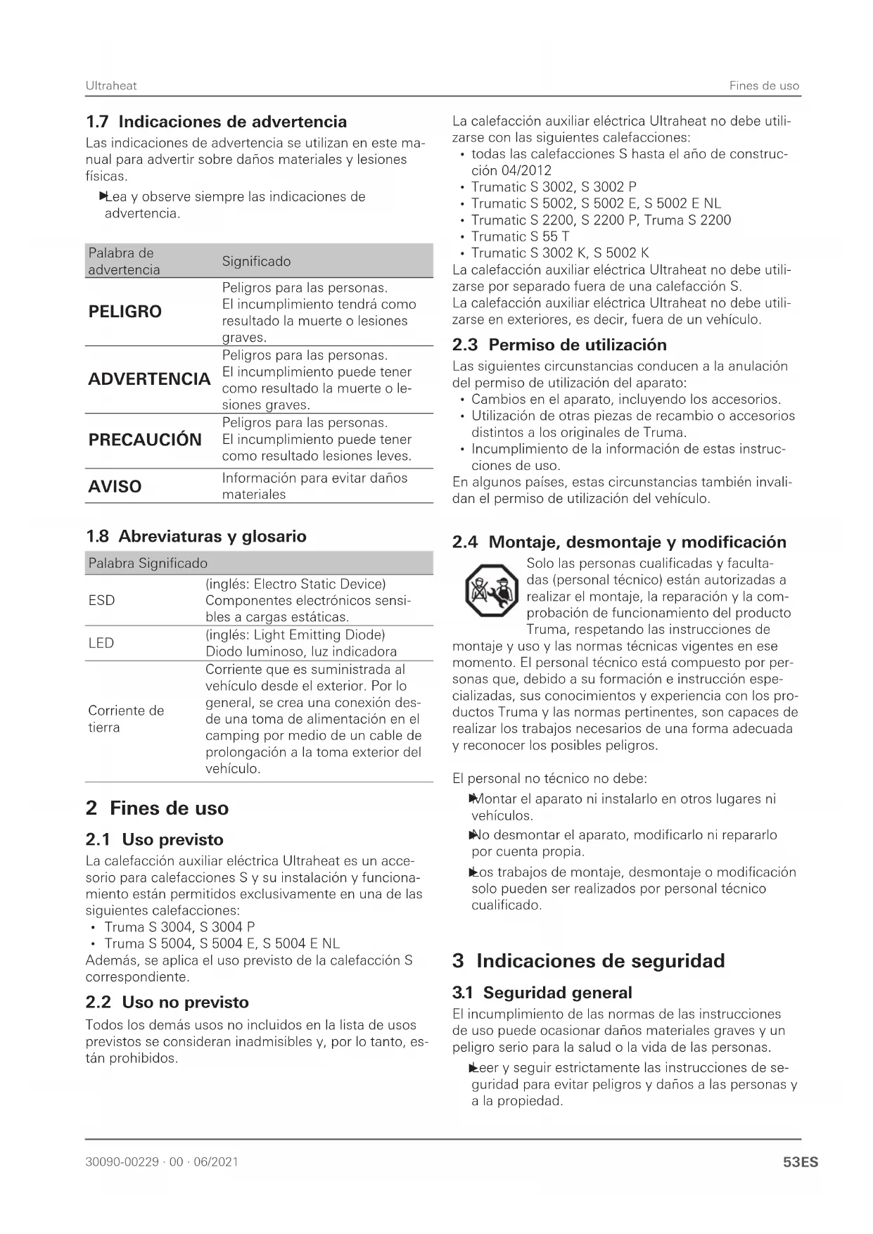 Inhaltsverzeichnis 1 Sobre estas instrucciones 52 11 Número de documento 52 12 Validez 52 13 Denominaciones 52 14 Grupo destinatario 52 15 Documentos vigentes 52 16 Símbolos y medios de representación 52 17 Indicaciones de advertencia 53 18 Abreviaturas y glosario 53 2 Fines de uso 53 21 Uso previsto 53 22 Uso no previsto 53 23 Permiso de utilización 53 24 Montaje, desmontaje y modificación 53 3 Indicaciones de seguridad 53 31 Seguridad general 53 32 Obligación del usuario gestionador / propietario del vehículo 54 33 Funcionamiento seguro 54 34 Comportamiento en caso de anomalías 55 4 Descripción del producto 55 41 Estructura 55 42 Identificación del producto 55 43 Función 55 44 Funcionamiento 55 45 Unidad de mando 56 46 Accesorios* 56 5 Puesta en marcha 56 6 Manejo 56 61 Encender Ultraheat 56 62 Apagar Ultraheat 56 7 Fallos 56 8 Limpieza y cuidado 57 9 Reparación 57 10 Eliminación de residuos y reciclaje 57 11 Datos técnicos 57 12 Garantía 57 121 Cobertura de la garantía del fabricante 57 122 Exclusión de la garantía 58 123 Ejercicio del derecho de la garantía 58 1 Sobre estas instrucciones Estas instrucciones son parte del producto Las instrucciones de uso deben llevarse siempre en el vehículo Permitir que las indicaciones de seguridad sean ac- cesibles también para otros usuarios