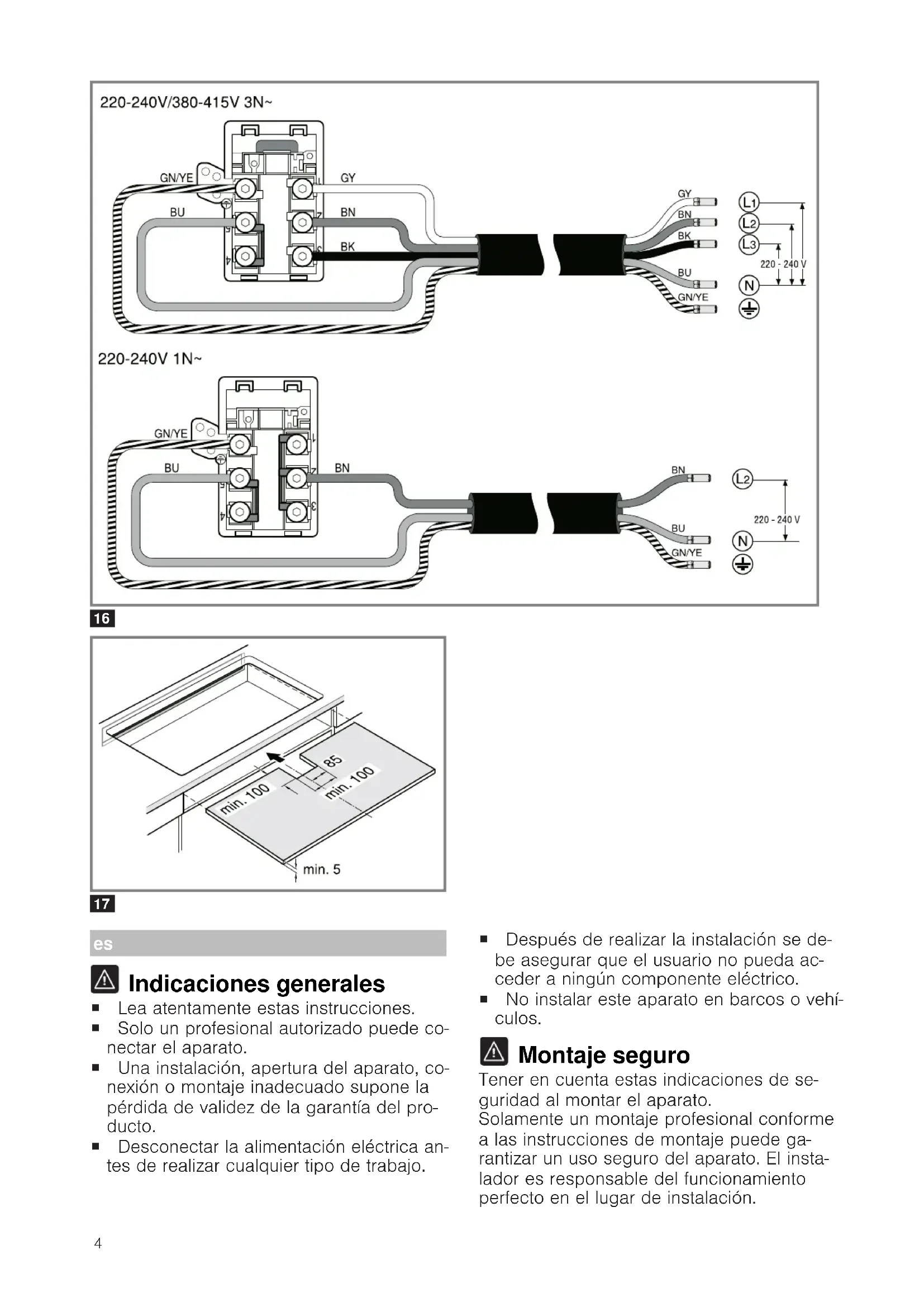 Indicaciones generales ¡ Lea atentamente estas instrucciones. ¡ Solo un profesional autorizado puede co- nectar el aparato. ¡ Una instalación, apertura del aparato, co- nexión o montaje inadecuado supone la pérdida de validez de la garantía del pro- ducto. ¡ Desconectar la alimentación eléctrica an- tes de realizar cualquier tipo de trabajo. ¡ Después de realizar la instalación se de- be asegurar que el usuario no pueda ac- ceder a ningún componente eléctrico. ¡ No instalar este aparato en barcos o vehí- culos. Montaje seguro Tener en cuenta estas indicaciones de se- guridad al montar el aparato. Solamente un montaje profesional conforme a las instrucciones de montaje puede ga- rantizar un uso seguro del aparato. El insta- lador es responsable del funcionamiento perfecto en el lugar de instalación.5 ADVERTENCIA‒¡Peligro: magnetismo! El aparato contiene imanes permanentes. Estos pueden repercutir en el correcto fun- cionamiento de implantes electrónicos co- mo marcapasos o bombas de insulina. ▶ Las personas con implantes electrónicos deberán mantener una distancia mínima de 10cm respecto al aparato. ADVERTENCIA‒¡Riesgo de lesiones! Las piezas que estén accesibles durante el montaje pueden tener los bordes afilados o causar cortes al tocarlas. ▶ Usar guantes de protección. Los productos químicos pueden ser peligro- sos. Para manipular los productos quími- cos, es necesario seguir las recomendacio- nes de los fabricantes de dichos productos. ▶ Llevar puesto el equipo de protección. Indicaciones relativas a la conexión eléctrica Para conectar electricamente el aparato de forma segura, consultar estas indicaciones. ¡ Sólo un profesional autorizado o un técnico del Servicio de Asistencia con formación específica puede conectar el aparato. Se tendrá que regir por las disposiciones de la compañía abastecedo- ra de la electricidad de la zona. ¡ El aparato debe ser conectado a la instalación fija y deben ser incorporados medios de desconexión a la instalación fija de acuerdo a las reglamenta- ciones de la instalación. ¡ El fabricante no asume responsabilidad alguna por fallos de funcionamiento o posibles daños de- rivados de una mala instalación eléctrica. Tipo de conexión ¡ El aparato pertenece a la clase de protección 1. Por esta razón, solo puede utilizarse conectado a una conexión con conductor de toma a tierra. Cable de alimentación Puede estar conectado en la caja de conexión de la placa de cocción o suministrado con el aparato. ¡ Los datos de conexión necesarios están indica- dos en la placa de características y en los esque- mas de conexión. ¡ Utilizar únicamente el cable de conexión suminis- trado con el aparato o por el Servicio de Asisten- cia Técnica. En caso de necesitar un cable de mayor longitud contacte con el Servicio de Asis- tencia Técnica. Disponible hasta 2,20 m Indicaciones relativas al mueble de montaje ¡ Las placas de inducción solo pueden ser instala- das sobre cajón u hornos con ventilación forzada. Debajo de la placa de cocción no se pueden ins- talar frigoríficos, lavavajillas, hornos sin ventila- ción, lavadoras o secadoras. ¡ Asegurarse de que el mueble empotrado es resis- tente a una temperatura de 90 °C como mínimo. Encimera Siga las recomendaciones del fabricante de la enci- mera. ¡ Plana, horizontal, estable. ¡ La encimera donde se instale el aparato debe ser resistente a pesos de 60kg aprox. ¡ En encimeras finas utilizar un material de refuerzo resistente al calor y a la humedad. ¡ La planitud de la placa de cocción solo debe comprobarse una vez instalada en el hueco de encastre. Campana extractora ¡ La distancia mínima entre la campana extractora y la placa de cocción debe ser al menos la distan- cia indicada en las instrucciones de montaje de la campana de extracción. Preparación de los muebles de montaje