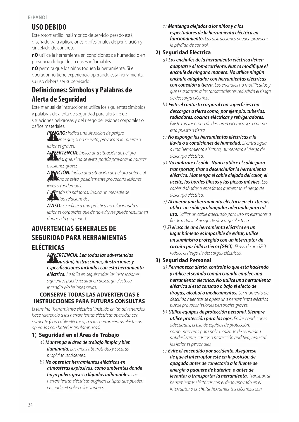 a ) Mantenga el área de trabajo limpia y bien iluminada. Las áreas abarrotadas y oscuras propicianaccidentes. b ) No opere las herramientas eléctricas en atmósferas explosivas, como ambientes donde haya polvo, gases o líquidos inflamables. Las herramientas eléctricas originan chispas que pueden encender el polvo o losvapores. Definiciones: Símbolos y Palabras de Alerta de Seguridad Este manual de instrucciones utiliza los siguientes símbolos y palabras de alerta de seguridad para alertarle de situaciones peligrosas y del riesgo de lesiones corporales o dañosmateriales.