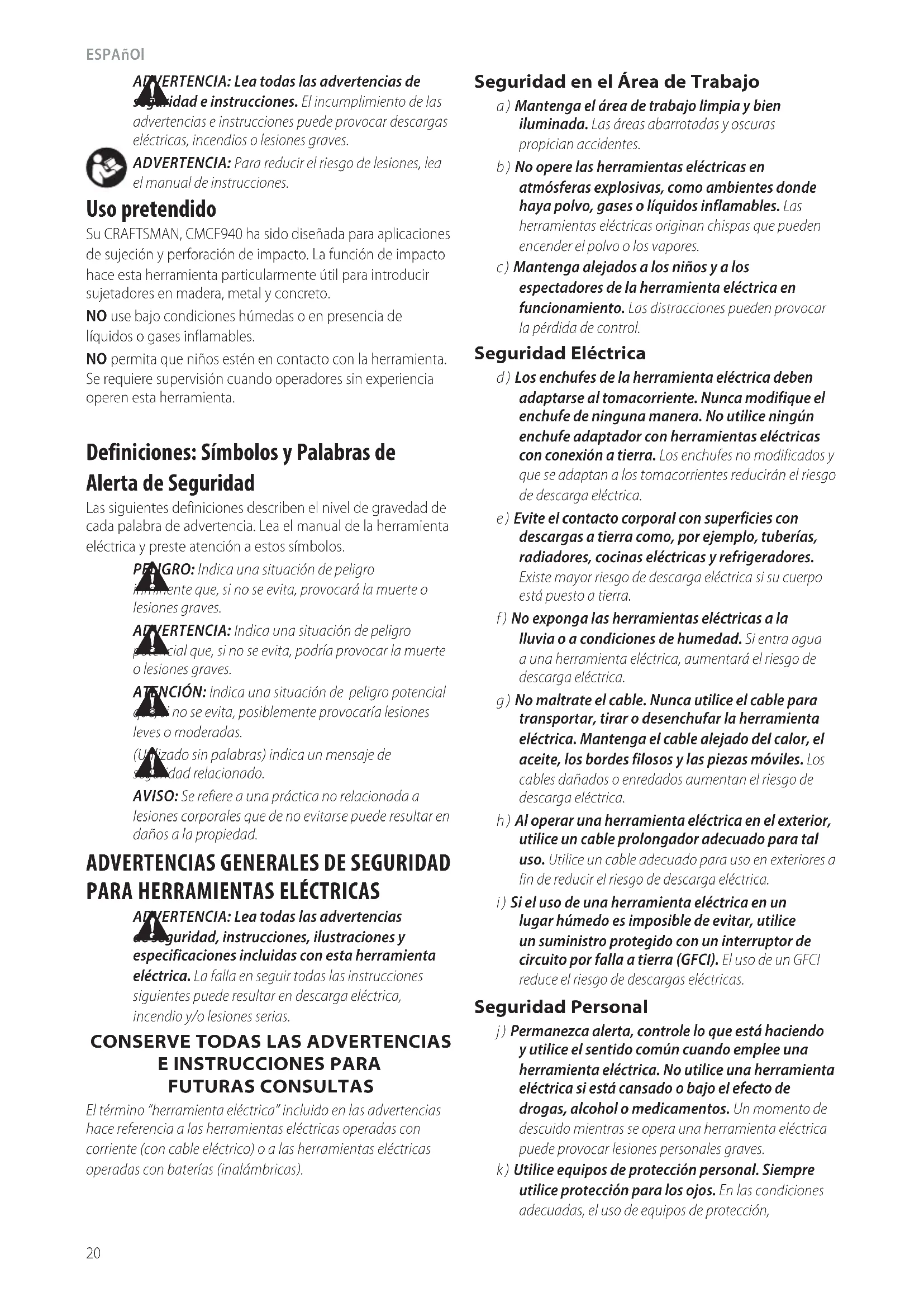 (Utilizado sin palabras) indica un mensaje de seguridadrelacionado. AVISO: Se refiere a una práctica no relacionada a lesiones corporales que de no evitarse puede resultar en daños a lapropiedad. Uso pretendido Su CRAFTSMAN, CMCF940 ha sido diseñada para aplicaciones de sujeción y perforación de impacto. La función de impacto hace esta herramienta particularmente útil para introducir sujetadores en madera, metal y concreto. NO use bajo condiciones húmedas o en presencia de líquidos o gases inflamables. NO permita que niños estén en contacto con la herramienta. Se requiere supervisión cuando operadores sin experiencia operen esta herramienta. Español (traducido de las instrucciones originales)