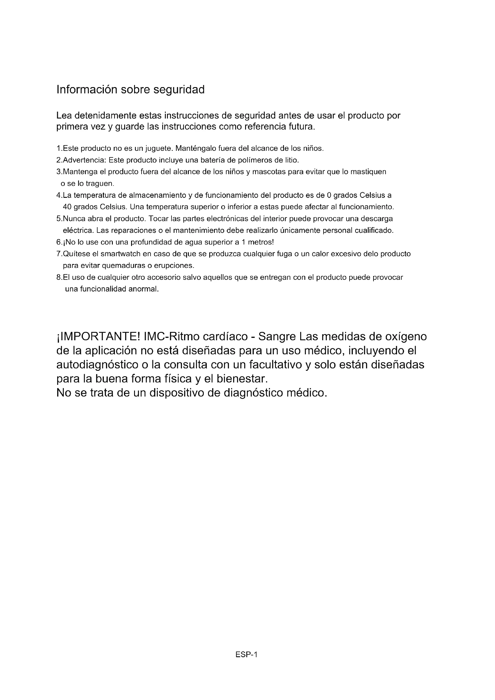 ESP-3 Cuando la pulsera esté correctamente conectada con el teléfono, la pulsera se sincronizará con la fecha y la hora del teléfono. Y la aplicación se sincronizará con los datos deportivos de la pulsera, los datos de monitorización del ritmo cardíaco, los datos de la tensión arterial, etc. Pulse brevemente el botón táctil del brazalete para cambiar de función y manténgalo pulsado para acceder a la función seleccionada. Para apagar el reloj, acceda al menú de «Apagado» y mantenga pulsado el botón táctil durante 3 segundos. Para encender el reloj, pulse el botón táctil durante 3 segundos.Ejercicio: Cuenta el tiempo de ejercicio diario; borra los datos a 00:00; se ve el historial en la aplicación. Monitor de ritmo cardíaco: mide automáticamente el ritmo cardíaco cuando se enciende la función y se guardarán en la aplicación los datos del ritmo cardíaco. Prueba SPO