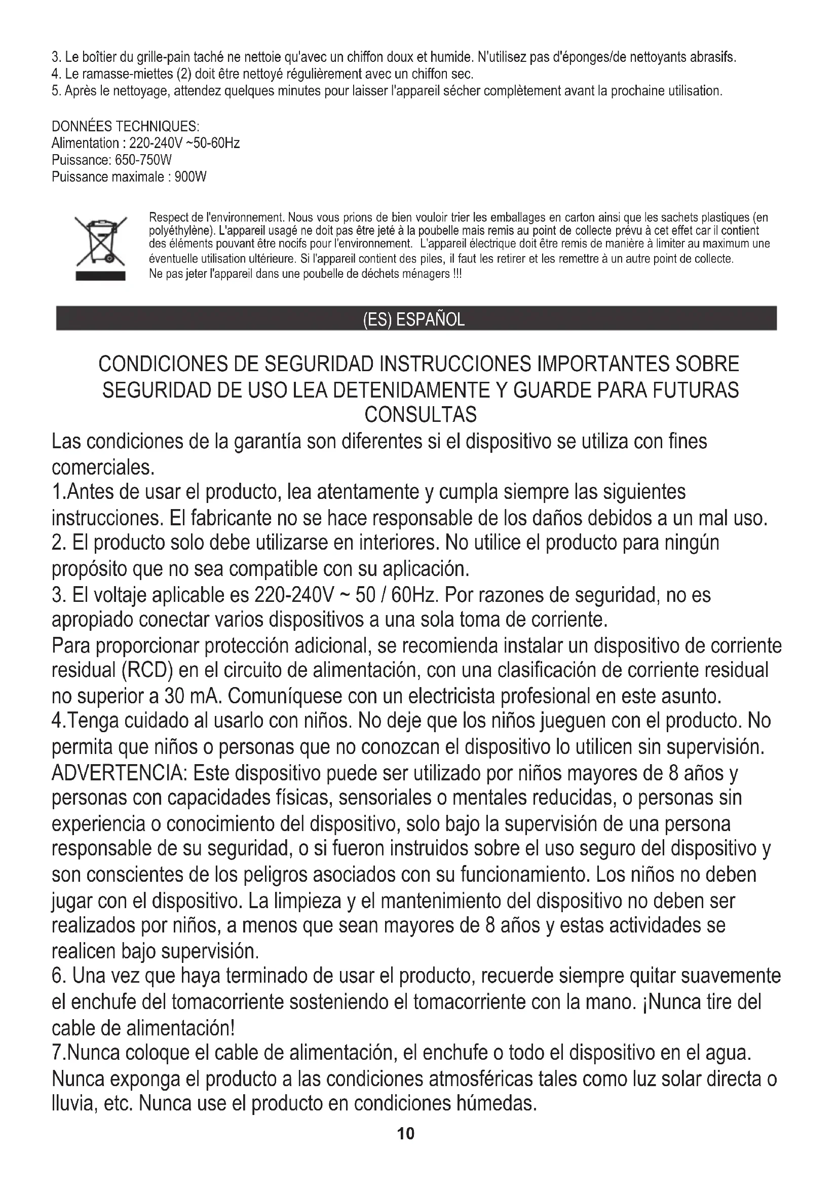propósito que no sea compatible con su aplicación. 7.Nunca coloque el cable de alimentación, el enchufe o todo el dispositivo en el agua. Nunca exponga el producto a las condiciones atmosféricas tales como luz solar directa o lluvia, etc. Nunca use el producto en condiciones húmedas. Para proporcionar protección adicional, se recomienda instalar un dispositivo de corriente residual (RCD) en el circuito de alimentación, con una clasificación de corriente residual no superior a 30 mA. Comuníquese con un electricista profesional en este asunto. ADVERTENCIA: Este dispositivo puede ser utilizado por niños mayores de 8 años y personas con capacidades físicas, sensoriales o mentales reducidas, o personas sin experiencia o conocimiento del dispositivo, solo bajo la supervisión de una persona responsable de su seguridad, o si fueron instruidos sobre el uso seguro del dispositivo y son conscientes de los peligros asociados con su funcionamiento. Los niños no deben jugar con el dispositivo. La limpieza y el mantenimiento del dispositivo no deben ser realizados por niños, a menos que sean mayores de 8 años y estas actividades se realicen bajo supervisión.