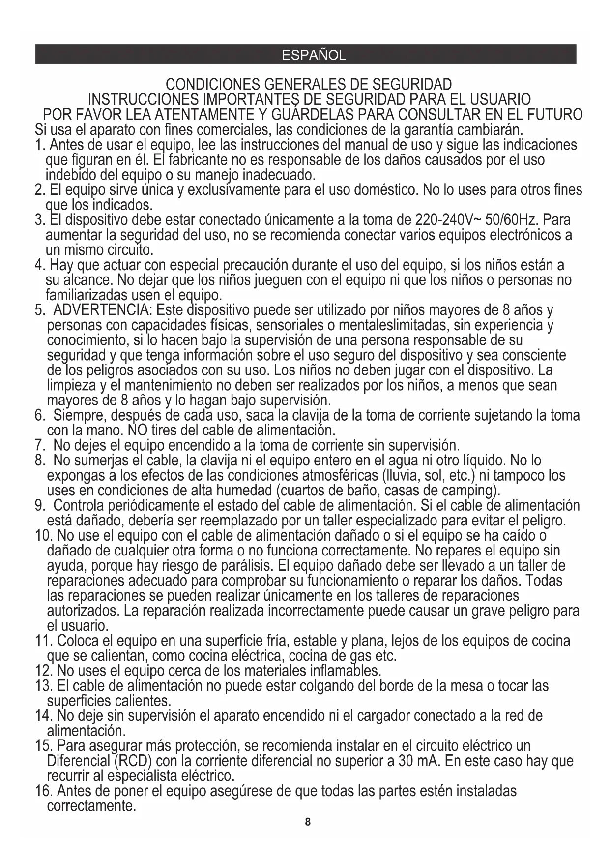 5. ADVERTENCIA: Este dispositivo puede ser utilizado por niños mayores de 8 años y