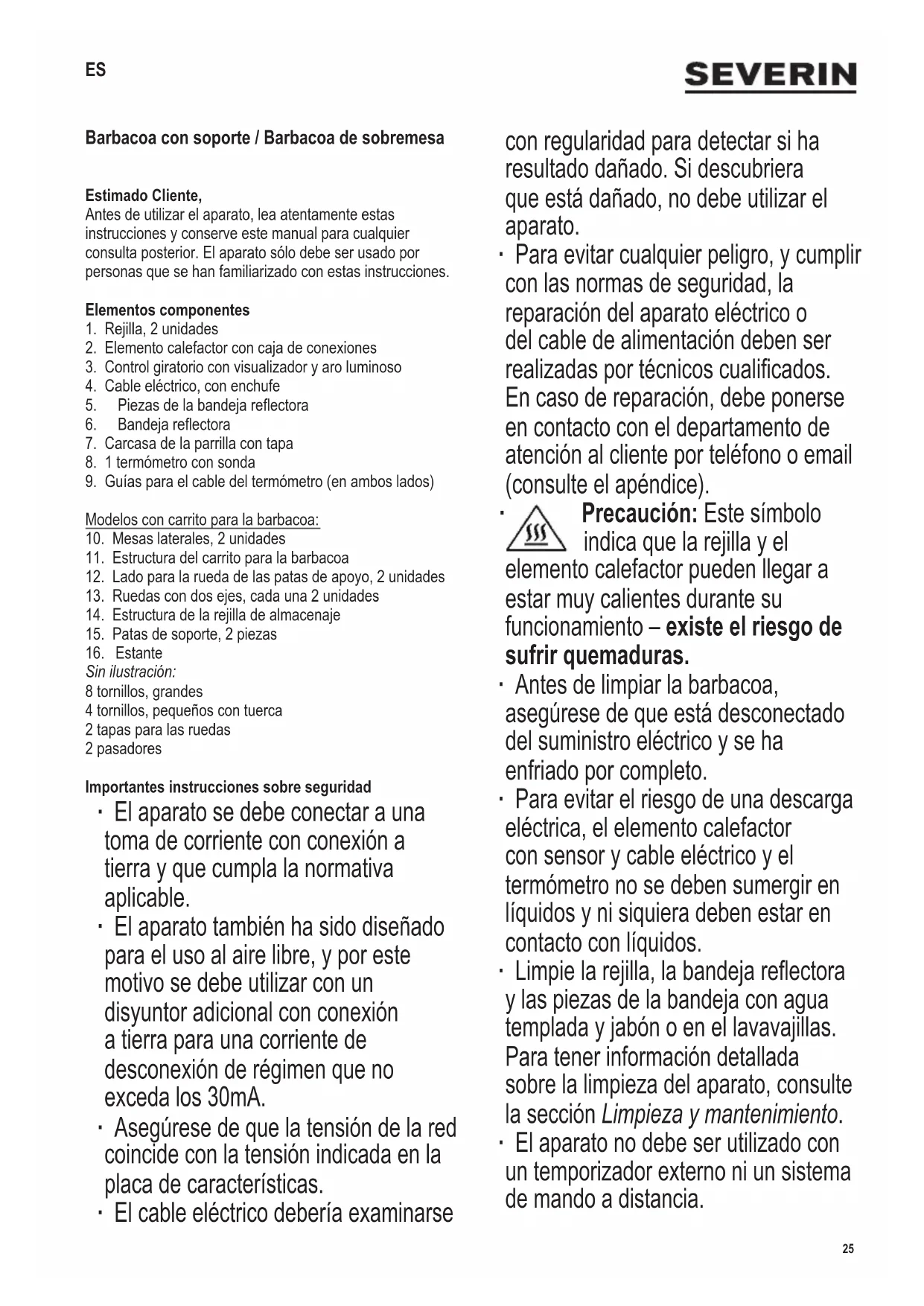 Precaución: Este símbolo indica que la rejilla y el elemento calefactor pueden llegar a estar muy calientes durante su funcionamiento – existe el riesgo de sufrir quemaduras. ∙ Antes de limpiar la barbacoa, asegúrese de que está desconectado del suministro eléctrico y se ha enfriado por completo. ∙ Para evitar el riesgo de una descarga eléctrica, el elemento calefactor con sensor y cable eléctrico y el termómetro no se deben sumergir en líquidos y ni siquiera deben estar en contacto con líquidos. ∙ Limpielarejilla,labandejareectora y las piezas de la bandeja con agua templada y jabón o en el lavavajillas. Para tener información detallada sobre la limpieza del aparato, consulte la sección Limpieza y mantenimiento. ∙ El aparato no debe ser utilizado con un temporizador externo ni un sistema de mando a distancia. ES26 142 x 208 mm ∙ ¡Advertencia! Nunca, bajo ninguna circunstancia, utilice carbón ni ningún otro combustible sólido o líquido para que funcione la barbacoa. ∙ Cuidado: No cubra la rejilla de la barbacoa con papel de aluminio, platos de asado u otros artículos, porque la acumulación de calor resultante podría dañar gravemente la barbacoa. ∙ Se puede añadir hasta un máximo de 2.0ldeaguaenlabandejareectora. ∙ Este aparato ha sido diseñado para el uso doméstico u otra aplicación similar, por ejemplo - encocinasdepersonal,enocinasy otros puntos comerciales, - en empresas agrícolas, - por los clientes de hoteles, pensiones, etc. y alojamientos similares, - en casas rurales. ∙ Este aparato podrá ser utilizado por niños (mayores de 8 años) y personas con reducidas facultades físicas, sensoriales o mentales, o sin experiencia ni conocimiento del producto, siempre que hayan recibido la supervisión o instrucciones referentes al uso del aparato y entiendan por completo el peligro y las precauciones de seguridad. ∙ Los niños no deben jugar con el aparato. ∙ No se debe permitir que los niños realicen ningún trabajo de limpieza o mantenimiento del aparato a menos que esté bajo vigilancia y tengan más de 8 años. ∙ El aparato y su cable eléctrico siempre se deben mantener fuera del alcance de niños menores de 8 años. ∙ Precaución: Mantenga a los niños alejados del material de embalaje, porque podría ser peligroso, existeelpeligrodeasxia. ∙ Antes de utilizar el aparato, se debe comprobar que tanto la unidad principal como cualquier accesorio no están defectuosos. En caso de que el aparato caiga sobreunasuperciedura,porejemplo,nosedebe utilizar de nuevo: incluso los desperfectos no visibles pueden tener efectos adversos sobre la seguridad en el uso del aparato. ∙ Durante el funcionamiento, la barbacoa debe ser colocadasobreunasupercietermorresistente, insensible a salpicaduras y manchas. Cuando se cocinan alimentos con un contenido alto de grasa o humedad, no se puede siempre evitar las salpicaduras. ∙ No coloque la barbacoa junto a una pared ni esquina, y compruebequenoseguardaningúnmaterialinamable junto a la barbacoa. ∙ Recuerde que los alimentos con alto contenido de grasa o humedad tienen tendencia a prenderse fuego; por este motivo siempre debe llenar la bandeja reectora con agua, antes de su utilización. No conecte la barbacoa al suministro eléctrico hasta haber llenado la bandeja con agua. El agua ayuda a enfriar la bandeja reectora,reducelacantidadde humo producido, y también facilita la limpieza. ∙ Asegúrese de controlar el nivel del agua. El agua debe añadirse con antelación, asegurándose de que no entra en contacto con el elemento calefactor. Precaución: Antes de añadir agua, desconecte la barbacoa de la toma de corriente. ∙ Antes de utilizar la barbacoa, asegúrese siempre de que el elemento calefactor está correctamente instalado en la bandeja reectora y la carcasa. ∙ La barbacoa debe estar bajo supervisión en todo momento durante su funcionamiento. ∙ No deje que el cable de alimentación entre en contacto con ninguna parte del aparato que esté caliente. ∙ Extienda el cable de alimentación de modo que nadie tropiece con el mismo. ∙ Desenchufe siempre el aparato de la toma de la pared - antes de llenar de agua la bandeja reectora, - después de usarlo; - en caso de alguna avería; - antes de limpiar el aparato. ∙ El uso de un cable alargador extendido o en bobina produce una pérdida de potencia en el suministro, junto con el posterior calentamiento del cable. Por ello, es necesario desenrollar el cable por completo antes de usarlo. Asegúrese de que el cable es adecuado para su27 142 x 208 mm uso al aire libre y para la potencia indicada (consultar la placa de características). ∙ No mueva el carrito de la barbacoa empujando de la mesa lateral. Primero debe retirar la mesa lateral y agarrar la estructura. ∙ No utilice el carrito de la barbacoa para transportar ningún artículo. ∙ No mueva la barbacoa mientras está funcionando. ∙ Vacíe el agua restante después de su utilización. ∙ ¡Precaución! Antes de trasladar, limpiar o guardar la barbacoa, asegúrese de que se haya enfriado completamente. ∙ ¡Precaución! Cuando no utilice la barbacoa, retire el elemento calefactor con caja de conexiones del aparato y guárdelo en un lugar seco y protegido. ∙ Asegúrese de que las otras partes de la barbacoa no se guardan en el exterior, ni en otro lugar donde estén expuestas a temperaturas extremas o elevada humedad. ∙ La barbacoa solo debe usarse con el termómetro incorporado o con el SEVERIN con n.º de artículo ZB