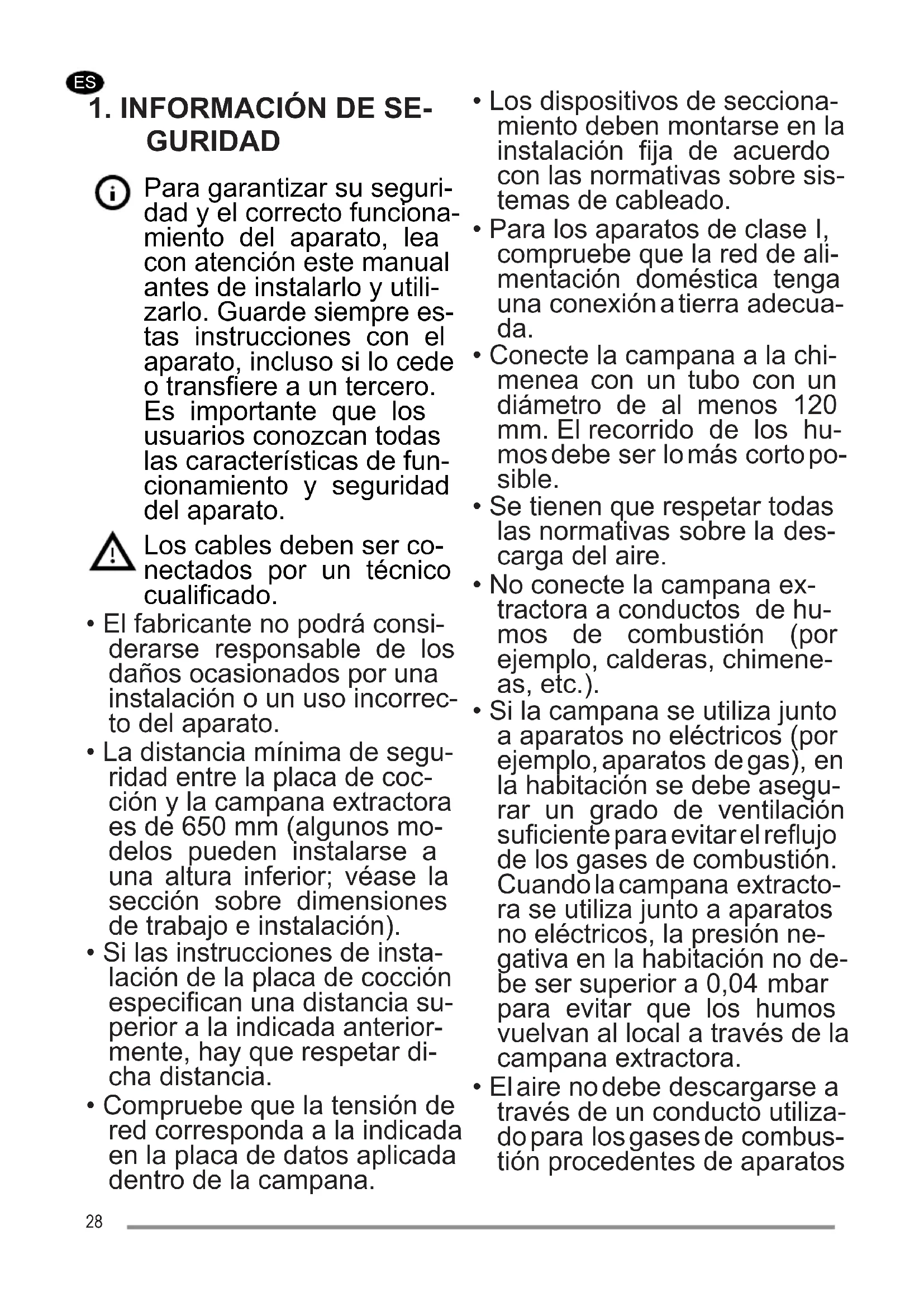 GURIDAD Para garantizar su seguri- dad y el correcto funciona- miento del aparato, lea con atención este manual antes de instalarlo y utili- zarlo. Guarde siempre es- tas instrucciones con el aparato, incluso si lo cede o transfiere a un tercero. Es importante que los usuarios conozcan todas las características de fun- cionamiento y seguridad del aparato. Los cables deben ser co- nectados por un técnico cualificado.