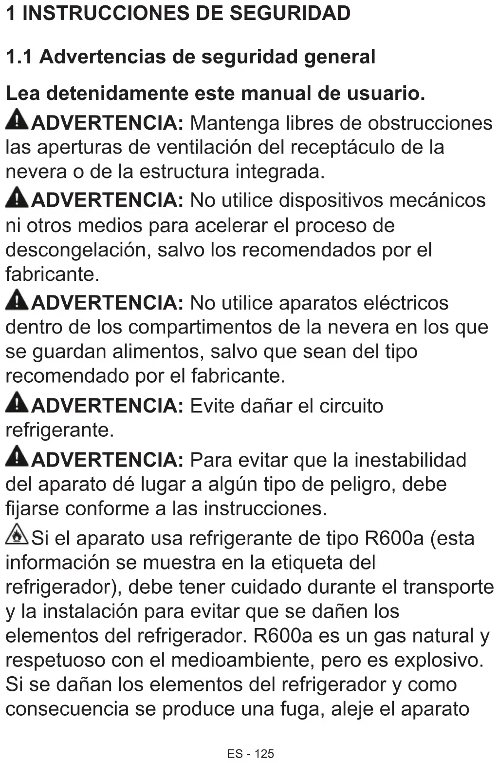 Lea detenidamente este manual de usuario. ADVERTENCIA: Mantenga libres de obstrucciones las aperturas de ventilación del receptáculo de la nevera o de la estructura integrada. ADVERTENCIA: No utilice dispositivos mecánicos ni otros medios para acelerar el proceso de descongelación, salvo los recomendados por el fabricante. ADVERTENCIA: No utilice aparatos eléctricos dentro de los compartimentos de la nevera en los que se guardan alimentos, salvo que sean del tipo recomendado por el fabricante. ADVERTENCIA: Evite dañar el circuito refrigerante. ADVERTENCIA: Para evitar que la inestabilidad del aparato dé lugar a algún tipo de peligro, debe jarse conforme a las instrucciones. Si el aparato usa refrigerante de tipo R600a (esta información se muestra en la etiqueta del refrigerador), debe tener cuidado durante el transporte y la instalación para evitar que se dañen los elementos del refrigerador. R600a es un gas natural y respetuoso con el medioambiente, pero es explosivo. Si se dañan los elementos del refrigerador y como consecuencia se produce una fuga, aleje el aparatoES - 126 de llamas abiertas o fuentes de calor y ventile unos minutos la habitación en la que se encuentre el refrigerador.