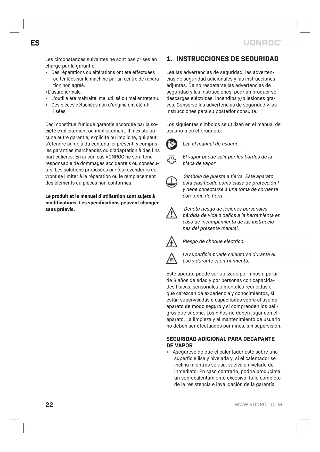 Los productos VONROC han sido desarrollados con los más altos estándares de calidad y VONROC ga- rantiza que están exentos de defectos relacionados con los materiales y la fabricación durante el periodo legalmente estipulado, a contar desde la fecha de compra original. En caso de que el producto presen- te defectos relacionados con los materiales y/o la fabricación durante este periodo, póngase directa- mente en contacto VONROC. La presente garantía se excluye en los siguientes casos: