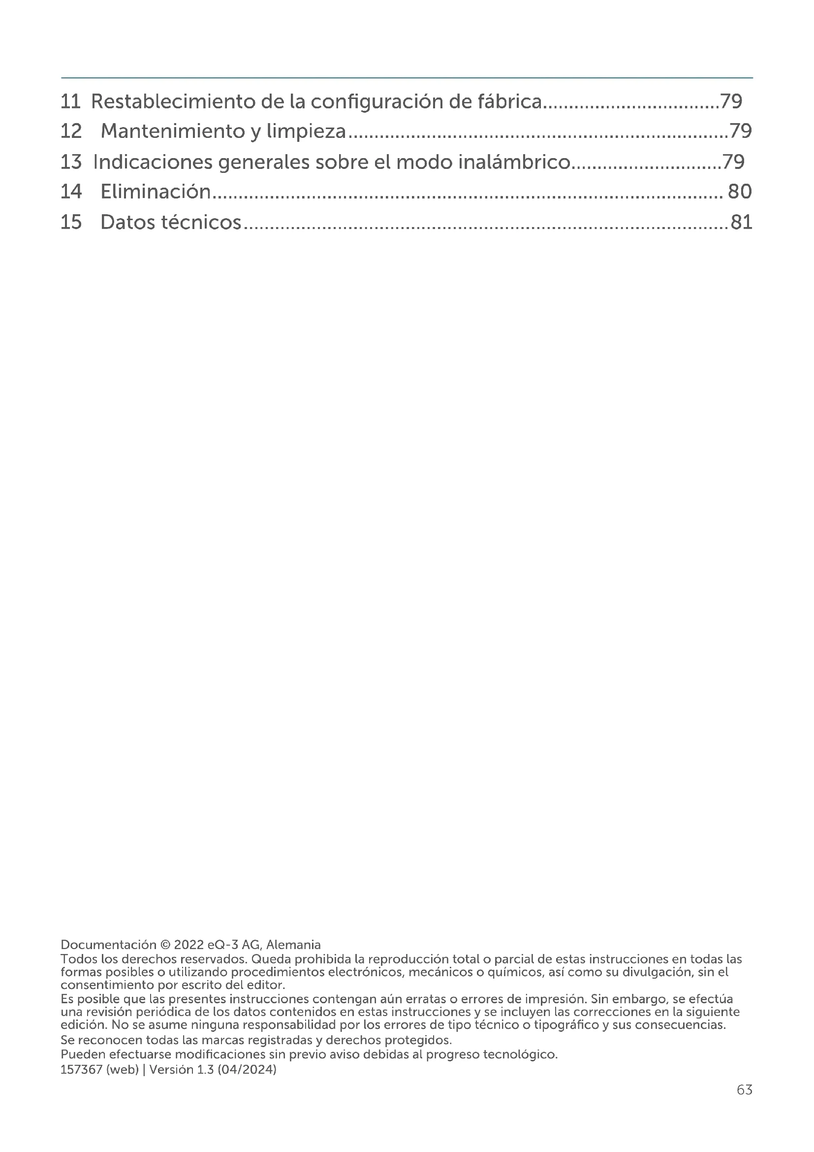 - Manual de instalación y uso ES63 Documentación © 2022 eQ-3 AG, Alemania Todos los derechos reservados. Queda prohibida la reproducción total o parcial de estas instrucciones en todas las formas posibles o utilizando procedimientos electrónicos, mecánicos o químicos, así como su divulgación, sin el consentimiento por escrito del editor. Es posible que las presentes instrucciones contengan aún erratas o errores de impresión. Sin embargo, se efectúa una revisión periódica de los datos contenidos en estas instrucciones y se incluyen las correcciones en la siguiente edición. No se asume ninguna responsabilidad por los errores de tipo técnico o tipográfico y sus consecuencias. Se reconocen todas las marcas registradas y derechos protegidos. Pueden efectuarse modificaciones sin previo aviso debidas al progreso tecnológico. 157367 (web) | Versión 1.3 (04/2024) 11 Restablecimiento de la configuración de fábrica p. 79