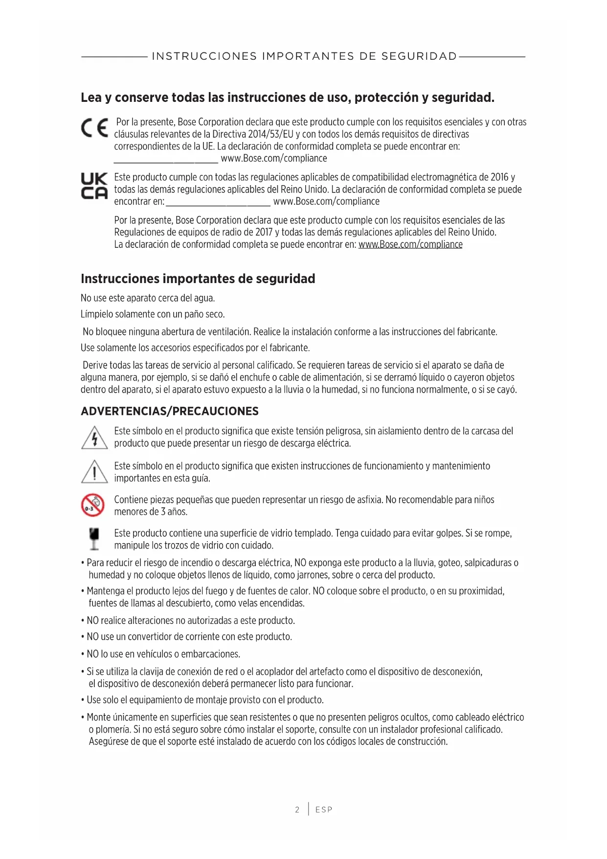 Lea y conserve todas las instrucciones de uso, protección y seguridad. Por la presente, Bose Corporation declara que este producto cumple con los requisitos esenciales y con otras cláusulas relevantes de la Directiva 2014/53/EU y con todos los demás requisitos de directivas correspondientes de la UE. La declaración de conformidad completa se puede encontrar en: www.Bose.com/compliancewww.Bose.com/compliance Este producto cumple con todas las regulaciones aplicables de compatibilidad electromagnética de 2016 y todas las demás regulaciones aplicables del Reino Unido. La declaración de conformidad completa se puede encontrar en: www.Bose.com/compliancewww.Bose.com/compliance Por la presente, Bose Corporation declara que este producto cumple con los requisitos esenciales de las Regulaciones de equipos de radio de 2017 y todas las demás regulaciones aplicables del Reino Unido. Ladeclaración de conformidad completa se puede encontrar en: www.Bose.com/compliancewww.Bose.com/compliance Instrucciones importantes de seguridad No use este aparato cerca del agua. Límpielo solamente con un paño seco. No bloquee ninguna abertura de ventilación. Realice la instalación conforme a las instrucciones del fabricante. Use solamente los accesorios especificados por el fabricante. Derive todas las tareas de servicio al personal calificado. Se requieren tareas de servicio si el aparato se daña de alguna manera, por ejemplo, si se dañó el enchufe o cable de alimentación, si se derramó líquido o cayeron objetos dentro del aparato, si el aparato estuvo expuesto a la lluvia o la humedad, si no funciona normalmente, o si se cayó. ADVERTENCIAS/PRECAUCIONES Este símbolo en el producto significa que existe tensión peligrosa, sin aislamiento dentro de la carcasa del producto que puede presentar un riesgo de descarga eléctrica. Este símbolo en el producto significa que existen instrucciones de funcionamiento y mantenimiento importantes en esta guía. Contiene piezas pequeñas que pueden representar un riesgo de asfixia. No recomendable para niños menores de 3 años. Este producto contiene una superficie de vidrio templado. Tenga cuidado para evitar golpes. Si se rompe, manipule los trozos de vidrio con cuidado.