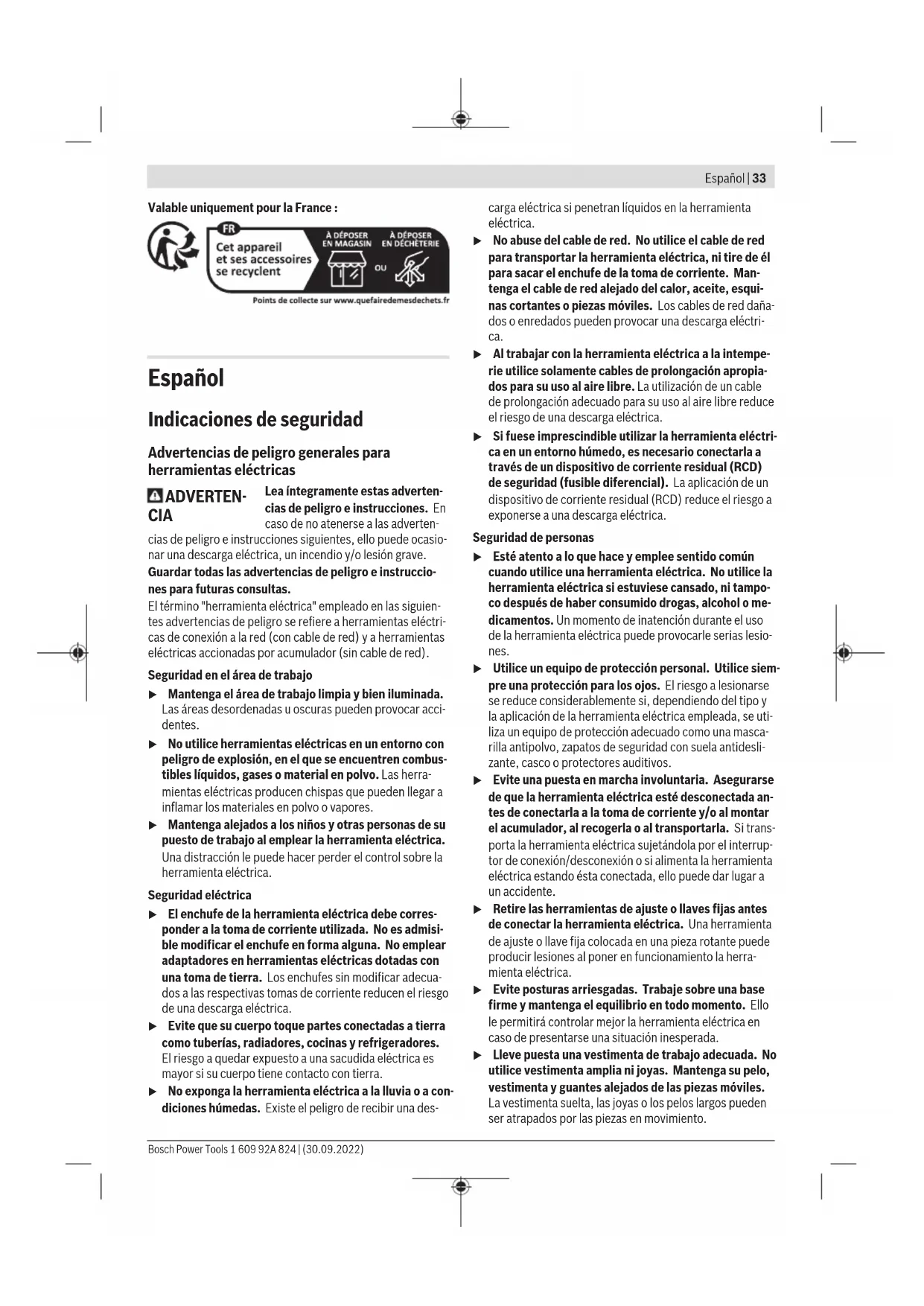 Máx. diámetro de disco amolador mm 230 230 230 230 230 230 Rosca de husillo amolador M14 M14 M14 M14 M14 M14 Máx. longitud de rosca del husillo amolador mm 25 25 25 25 25 25 Protección contra rearranque ● – ● – ● – Arranque suave ● – ● – ● – Peso según EPTA-Procedure01:2014 – con empuñadu- ra adicional amortiguadora de vibraciones kg 5,2 5,1 5,5 5,4 5,5 5,4 – con empuñadu- ra adicional es- tándar kg 5,1 5,0 5,4 5,3 5,4 5,3 Clase de protec- ción /II /II /II /II /II /II Las indicaciones son válidas para una tensión nominal [U] de 230 V. Estas indicaciones pueden variar con tensiones divergentes y en ejecucio- nes específicas del país. Bosch Power Tools 1 609 92A 824 | (30.09.2022)38 | Español Indicaciones sobre las condiciones de conexión a la red paraGWS2000P/GWS2200P/GWS2400P: El aparato cumple los requisitos de la norma IEC 61000-3-11 y está sujeto a una conexión condicional. El aparato puede pro- vocar ocasionales fluctuaciones de tensión en condiciones de alimentación desfavorables. La impedancia de este aparato se establece como Z actual =0,18Ω. El usuario debe asegurarse de que el punto de conexión, con la impedancia Z max , en el que se enchufará el aparato cumple con el requisito de impedancia: Z actual