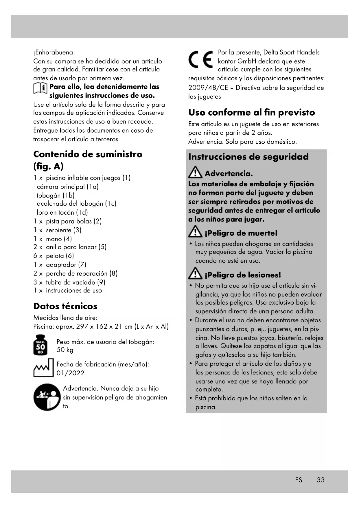 el área dañada y péguelo presionándolo con firmeza. Almacenamiento, limpieza ¡Cambie el agua del artículo con frecuencia, especialmente si hace calor y está sucia! Si no va a utilizarlo, almacene siempre el artículo des- inflado, seco y limpio y a temperatura ambiente. Las válvulas deben permanecer cerradas duran- te todo el tiempo de almacenamiento. Limpiarlo sólo con agua o agua jabonosa, no emplear nunca detergentes agresivos. Al almacenar el artículo para el invierno, no colocar objetos afi- lados sobre el mismo ni espolvorearlo con talco. Indicaciones para la eliminación Elimine el artículo y el material de embalaje conforme a la normativa legal local en la ac- tualidad. No deje material de embalaje, como bolsas de plástico, en manos de niños. Guarde el material de embalaje en un lugar inaccesible para éstos. Deseche los productos y embalajes de manera respetuosa con el medio ambiente. El código de reciclaje sirve para identificar diversos materiales para reincorporarlos en el ciclo de reciclaje. El código consta del símbolo de reciclaje, el cual debe reflejar el ciclo de recuperación, y de un número que identifica el material. Indicaciones relativas a la garantía y la gestión de servicios El artículo ha sido fabricado con gran esmero y sometido a controles constantes. Para el mismo, DELTA-SPORT HANDELSKON- TOR GmbH ofrece a los clientes finales particu- lares una garantía de tres años a contar desde la fecha de compra (periodo de garantía) con arreglo a las condiciones que se exponen a con- tinuación. La garantía tiene validez únicamente para fallos del material y fabricación. La garan- tía no cubre las piezas sometidas a un desgaste normal, las cuales se consideran piezas de desgaste (p. ej., pilas) así como tampoco piezas frágiles como, p. ej., interruptores, baterías o piezas fabricadas en vidrio o cristal. Se excluyen derechos derivados de esta garantía, si se ha realizado un uso incorrecto o abusivo del artículo o que no se encuentre dentro del marco del uso o ámbito de uso previs- tos o si no se ha observado lo recogido en el manual de instrucciones, a no ser que el cliente final demuestre que existen fallos del material o fabricación no derivados de una de las circuns- tancias expuestas anteriormente. Las demandas derivadas de la garantía sólo podrán presentarse dentro del periodo de garantía exhibiendo el comprobante de compra original. Le rogamos, por ello, que conserve el comprobante de compra original. El periodo de garantía no se verá prolongado por ningún tipo de reparación realizada con motivo de la ga- rantía, la garantía legal o como gesto de buena voluntad. Esto se aplica también a las piezas sustituidas o reparadas. Por favor, dirija sus quejas primero a la línea telefónica del servicio de atención al cliente que se indica a continuación o póngase en contacto con nosotros por correo electrónico. Si el caso está cubierto por la garantía, a nuestra elección, repararemos o cambiaremos gratuitamente el artículo o le restituiremos el precio de compra del mismo. De la garantía no se derivan otros derechos. Esta garantía no limitará sus derechos legales, especialmente los derechos de garantía frente al vendedor correspondiente. IAN: 385205_2107 Servicio España Tel.: 900 984 989 E-Mail: deltasport@lidl.es37 Hjertelig tillykke! Du har valgt at købe et kvalitetsprodukt. Lær produktet at kende, inden du bruger det første gang. Det gør du ved at læse nedenståen- de brugervejledning omhyggeligt. Brug kun produktet som beskrevet og til de angivne anvendelsesområder. Opbevar denne brugervejledning et sikkert sted. Udlever også alle dokumenter, hvis produktet videregives til en tredjepart. Leveringsomfang (afb. A) 1 x oplevelsessoppebassin (1) hovedkammer (1a) slidske (1b) polstring, slidske (1c) papegøje på træstub (1d) 1 x boldkuglebane (2) 1 x slange (3) 1 x abe (4) 2 x kastering (5) 6 x bold (6) 1 x adapter (7) 2 x reparationslap (8) 3 x udluftningsrør (9) 1 x brugervejledning Tekniske data Mål, luftfyldt: Poolbassin: ca. 297 x 162 x 21 cm (L x B x H) Maks. brugervægt, slidske: 50 kg Fremstillingsdato (måned/år): 01/2022 Advarsel. Lad aldrig barnet være uden opsyn – fare for drukning. Hermed erklærer Delta-Sport Handelskontor GmbH, at denne artikel er i overensstemmelse med følgende grundlæggende krav og de øvrige gældende bestemmelser: 2009/48/EF – legetøjsdirektiv Tilsigtet brug Denne artikel er legetøj til børn fra 2 års alderen til udendørs brug. Advarsel. Kun til privat brug. Sikkerhedsoplysninger Advarsel. Alle emballage- og monteringsmateri- aler er ikke en del af legetøjet og skal altid fjernes af sikkerhedsmæssige grunde, inden artiklen udleveres til børn at lege med. Livsfare!