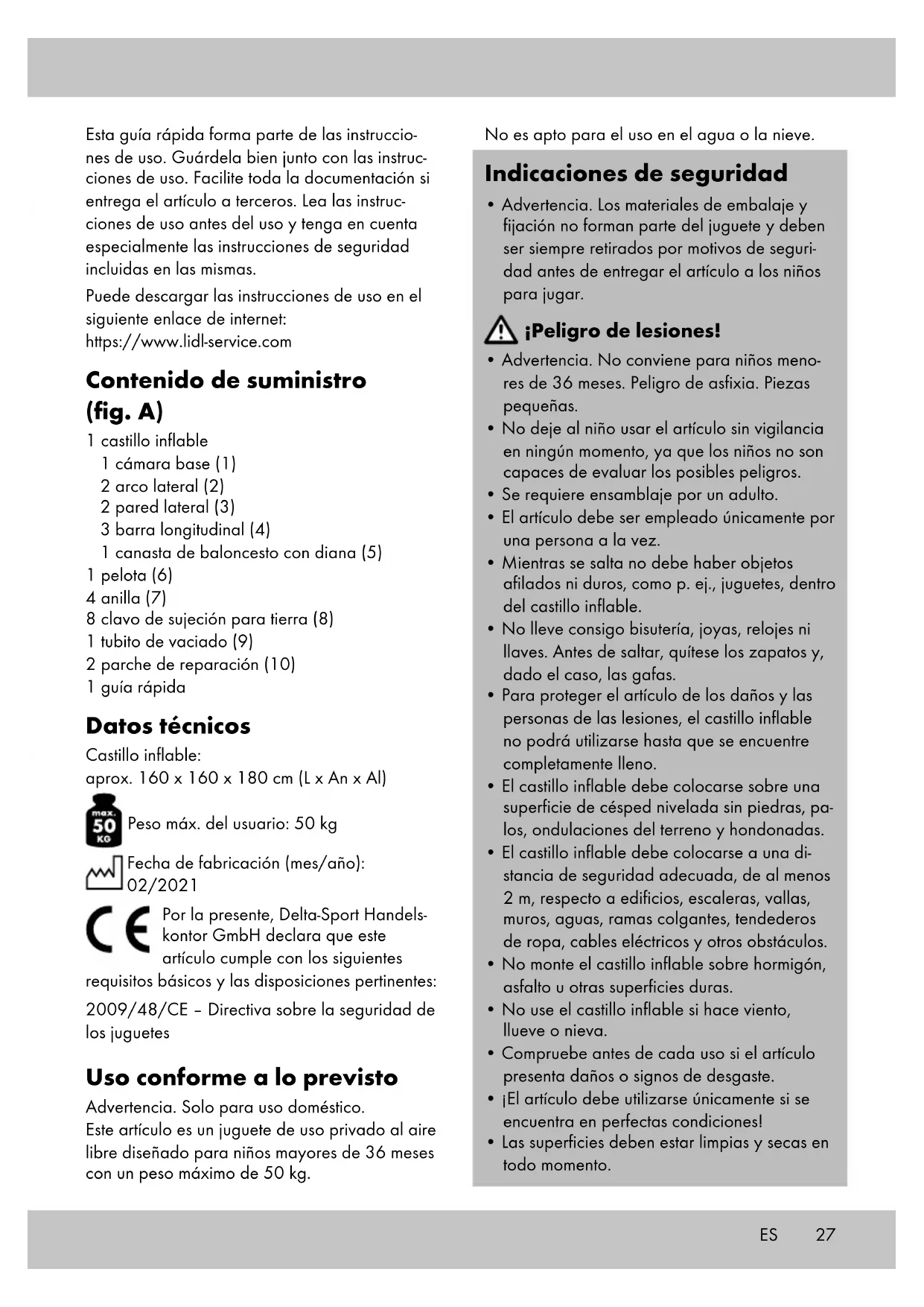 - Záplatu stiahnite z papiera, položte ju na poškodenú oblasť a pevne ju pritlačte. SK27 Esta guía rápida forma parte de las instruccio- nes de uso. Guárdela bien junto con las instruc- ciones de uso. Facilite toda la documentación si entrega el artículo a terceros. Lea las instruc- ciones de uso antes del uso y tenga en cuenta especialmente las instrucciones de seguridad incluidas en las mismas. Puede descargar las instrucciones de uso en el siguiente enlace de internet: https://www.lidl-service.com Contenido de suministro (fig. A) 1 castillo inflable 1 cámara base (1) 2 arco lateral (2) 2 pared lateral (3) 3 barra longitudinal (4) 1 canasta de baloncesto con diana (5) 1 pelota (6) 4 anilla (7) 8 clavo de sujeción para tierra (8) 1 tubito de vaciado (9) 2 parche de reparación (10) 1 guía rápida Datos técnicos Castillo inflable: aprox. 160 x 160 x 180 cm (L x An x Al) Peso máx. del usuario: 50 kg Fecha de fabricación (mes/año): 02/2021 Por la presente, Delta-Sport Handels- kontor GmbH declara que este artículo cumple con los siguientes requisitos básicos y las disposiciones pertinentes: 2009/48/CE – Directiva sobre la seguridad de los juguetes Uso conforme a lo previsto Advertencia. Solo para uso doméstico. Este artículo es un juguete de uso privado al aire libre diseñado para niños mayores de 36 meses con un peso máximo de 50 kg. No es apto para el uso en el agua o la nieve. Indicaciones de seguridad