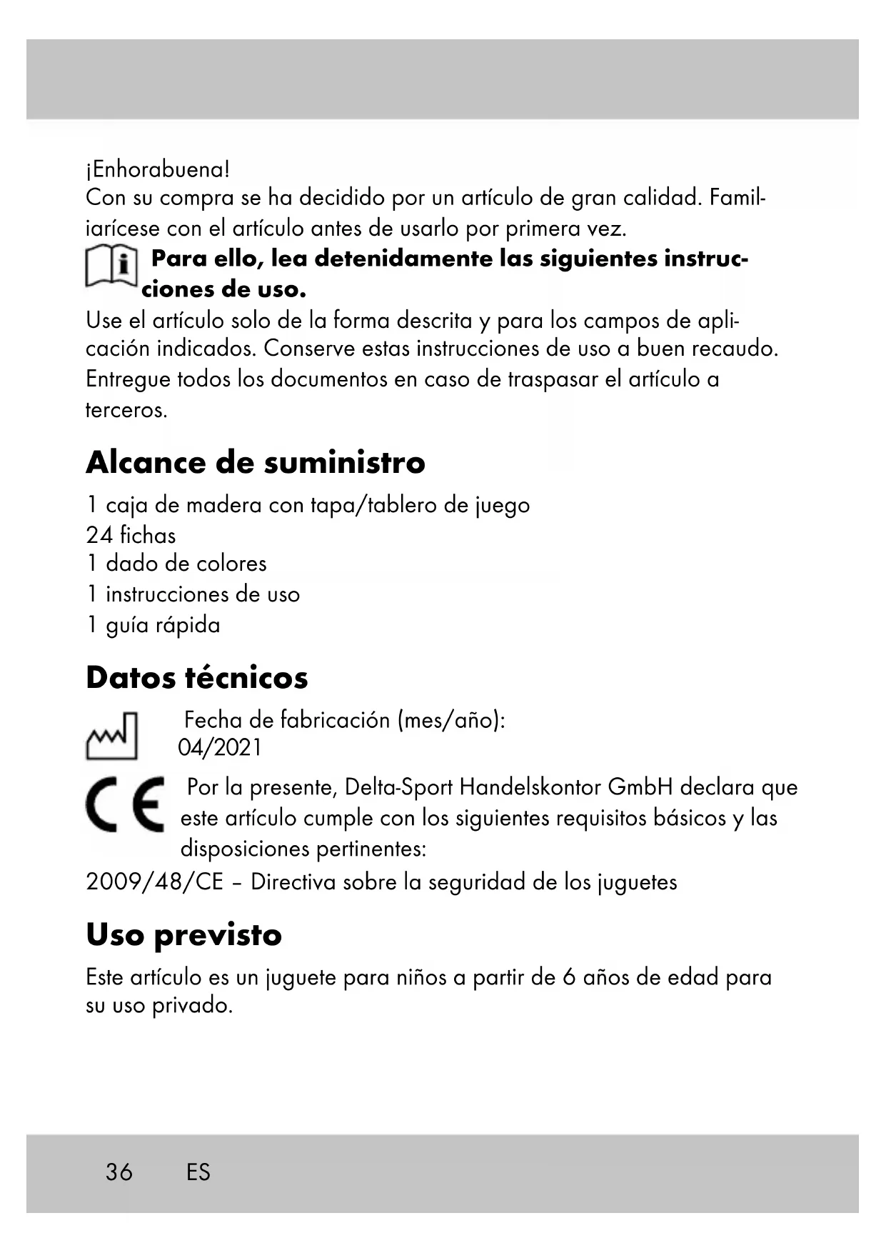 - Gana el jugador que consigue más fichas.38 Almacenamiento, limpieza Si no va a utilizarlo, almacene siempre el artículo seco y limpio y a tem- peratura ambiente. Límpielo únicamente pasando un paño de limpieza seco. ¡IMPORTANTE! No lo limpie con productos de limpieza agresivos. Indicaciones para la eliminación Elimine el artículo y el material de embalaje conforme a la normativa legal local en la actualidad. No deje material de embalaje, como bolsas de plástico, en manos de niños. Guarde el material de embalaje en un lugar inaccesible para éstos. Deseche los productos y embalajes de manera respetuosa con el medio ambiente. El código de reciclaje sirve para identificar diversos materiales para reincorporarlos en el ciclo de reciclaje. El código consta del símbolo de reciclaje, el cual debe reflejar el ciclo de recupera- ción, y de un número que identifica el material. Indicaciones relativas a la garantía y la gestión de servicios El artículo ha sido fabricado con gran esmero y sometido a controles constantes. Para el mismo, DELTA-SPORT HANDELSKONTOR GmbH ofrece a los clientes finales particulares una garantía de tres años a contar desde la fecha de compra (periodo de garantía) con arreglo a las condiciones que se exponen a continuación. La garantía tiene validez únicamente para fallos del material y fabricaci- ón. La garantía no cubre las piezas sometidas a un desgaste normal, las cuales se consideran piezas de desgaste (p. ej., pilas) así como tampoco piezas frágiles como, p. ej., interruptores, baterías o piezas fabricadas en vidrio o cristal. ES39ES Se excluyen derechos derivados de esta garantía, si se ha realizado un uso incorrecto o abusivo del artículo o que no se encuentre dentro del marco del uso o ámbito de uso previstos o si no se ha observado lo recogido en el manual de instrucciones, a no ser que el cliente final demuestre que existen fallos del material o fabricación no derivados de una de las circunstancias expuestas anteriormente. Las demandas derivadas de la garantía sólo podrán presentarse dentro del periodo de garantía exhibiendo el comprobante de compra original. Le rogamos, por ello, que conserve el comprobante de compra original. El periodo de garantía no se verá prolongado por ningún tipo de repa- ración realizada con motivo de la garantía, la garantía legal o como gesto de buena voluntad. Esto se aplica también a las piezas sustituidas o reparadas. Por favor, dirija sus quejas primero a la línea telefónica del servicio de atención al cliente que se indica a continuación o póngase en contacto con nosotros por correo electrónico. Si el caso está cubierto por la ga- rantía, a nuestra elección, repararemos o cambiaremos gratuitamente el artículo o le restituiremos el precio de compra del mismo. De la garantía no se derivan otros derechos. Esta garantía no limitará sus derechos legales, especialmente los de- rechos de garantía frente al vendedor correspondiente.40 IAN: 364364_2010 Servicio España Tel.: 902 59 99 22 (0,08 EUR/Min. + 0,11 EUR/llamada (tarifa normal)) (0,05 EUR/Min. + 0,11 EUR/llamada (tarifa reducida)) E-Mail: deltasport@lidl.es ES41DK Hjertelig tillykke! Du har valgt at købe et kvalitetsprodukt. Lær produktet at kende, inden du bruger det første gang. Det gør du ved at læse nedenstående brugervejledning omhyggeligt. Brug kun produktet som beskrevet og til de angivne anvendelsesområder. Opbevar denne brugervejledning et sikkert sted. Udlever også alle doku- menter, hvis produktet videregives til en tredjepart. Leveringsomfang 1 x trææske med spillebrætlåg 24 x spillesten 1 x farveterning 1 x brugervejledning 1 x kort vejledning Tekniske data Fremstillingsdato (måned/år): 04/2021 Hermed erklærer Delta-Sport Handelskontor GmbH, at denne artikel er i overensstemmelse med følgende grundlæggende krav og de øvrige gældende bestemmelser: 2009/48/EF – legetøjsdirektiv Bestemmelsesmæssig brug Denne artikel er legetøj beregnet til børn fra 6 år til privat brug. Sikkerhedsanvisninger