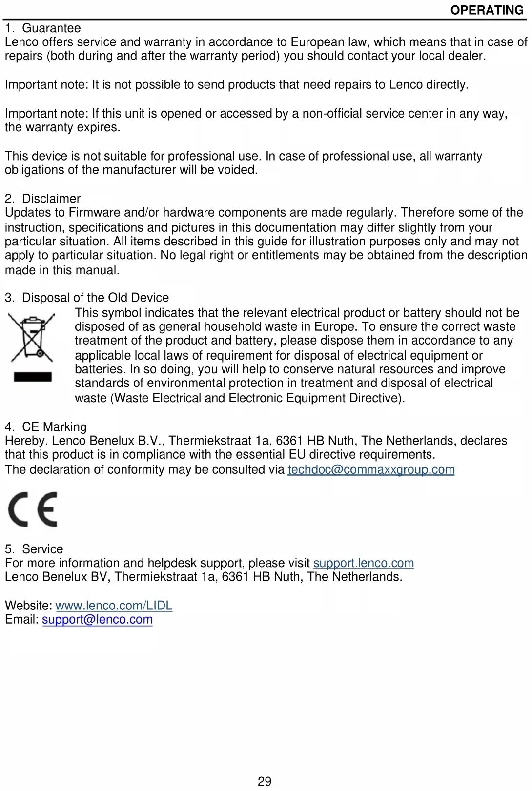 Por la presente, Lenco Benelux B.V., Thermiekstraat 1a, 6361 HB Nuth, Países Bajos, declara que este producto cumple con las exigencias esenciales de las directivas de la UE. La declaración de conformidad puede consultarse mediante techdoc@commaxxgroup.com