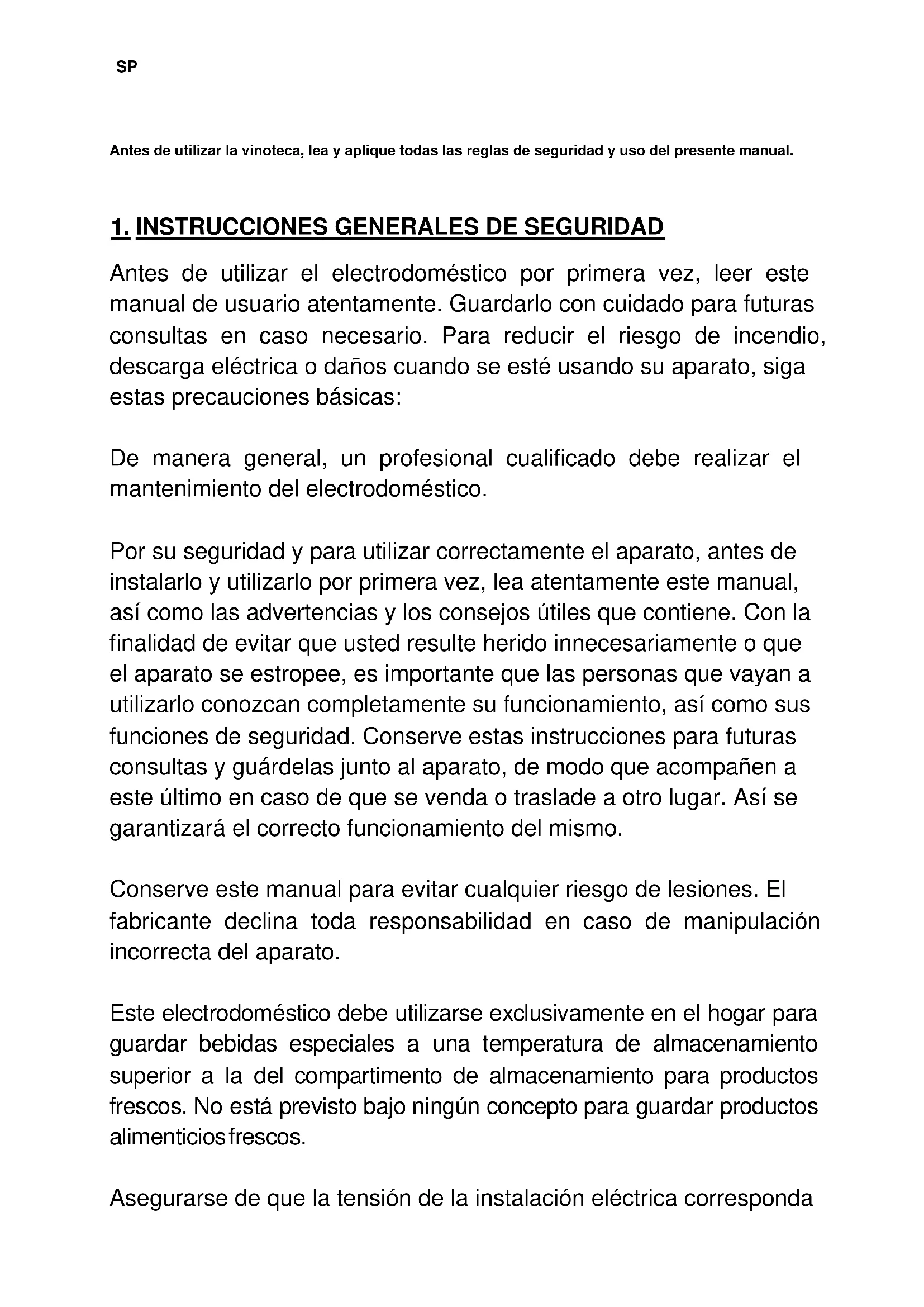 Antes de utilizar el electrodoméstico por primera vez, leer este manual de usuario atentamente. Guardarlo con cuidado para futuras consultas en caso necesario. Para reducir el riesgo de incendio, descarga eléctrica o daños cuando se esté usando su aparato, siga estas precauciones básicas: De manera general, un profesional cualificado debe realizar el mantenimiento del electrodoméstico. Por su seguridad y para utilizar correctamente el aparato, antes de instalarlo y utilizarlo por primera vez, lea atentamente este manual, así como las advertencias y los consejos útiles que contiene. Con la finalidad de evitar que usted resulte herido innecesariamente o que el aparato se estropee, es importante que las personas que vayan a utilizarlo conozcan completamente su funcionamiento, así como sus funciones de seguridad. Conserve estas instrucciones para futuras consultas y guárdelas junto al aparato, de modo que acompañen a este último en caso de que se venda o traslade a otro lugar. Así se garantizará el correcto funcionamiento del mismo. Conserve este manual para evitar cualquier riesgo de lesiones. El fabricante declina toda responsabilidad en caso de manipulación incorrecta del aparato. Este electrodoméstico debe utilizarse exclusivamente en el hogar para guardar bebidas especiales a una temperatura de almacenamiento superior a la del compartimento de almacenamiento para productos frescos. No está previsto bajo ningún concepto para guardar productos alimenticios frescos. Asegurarse de que la tensión de la instalación eléctrica correspondaSP con la placa de identificación del electrodoméstico; este último debe estar conectado a un sistema a tierra autorizado. Las reparaciones o conexiones incorrectas pueden causar riesgos para la seguridad. En caso de duda, solicitar a un profesional que compruebe la instalación eléctrica. Esta unidad debe estar correctamente conectada a la toma de corriente a tierra para su protección. No cortar ni retirar el hilo de puesta a tierra del cable de la red eléctrica suministrado. Por razones de seguridad, no utilizar un cable alargador eléctrico. Si el electrodoméstico está estropeado (p. ej., si ha recibido un golpe fuerte) o ha sufrido algún daño (subida de tensión debida a relámpagos, inundaciones o incendios), puede resultar peligroso utilizarlo. Desconectar el enchufe de la red eléctrica y solicitar a un reparador profesional autorizado que compruebe el electrodoméstico. Para impedir los peligros, no reemplace usted mismo el cable estropeado de la red eléctrica. Ponerse en contacto con el distribuidor, un centro de reparación autorizado o un reparador profesional. Este electrodoméstico debe colocarse de tal manera que el enchufe de la red eléctrica esté accesible. No mover el electrodoméstico cuando esté lleno: podría deformarse su estructura y no ser posible su reparación. Las partes eléctricas no deben estar directamente accesibles.