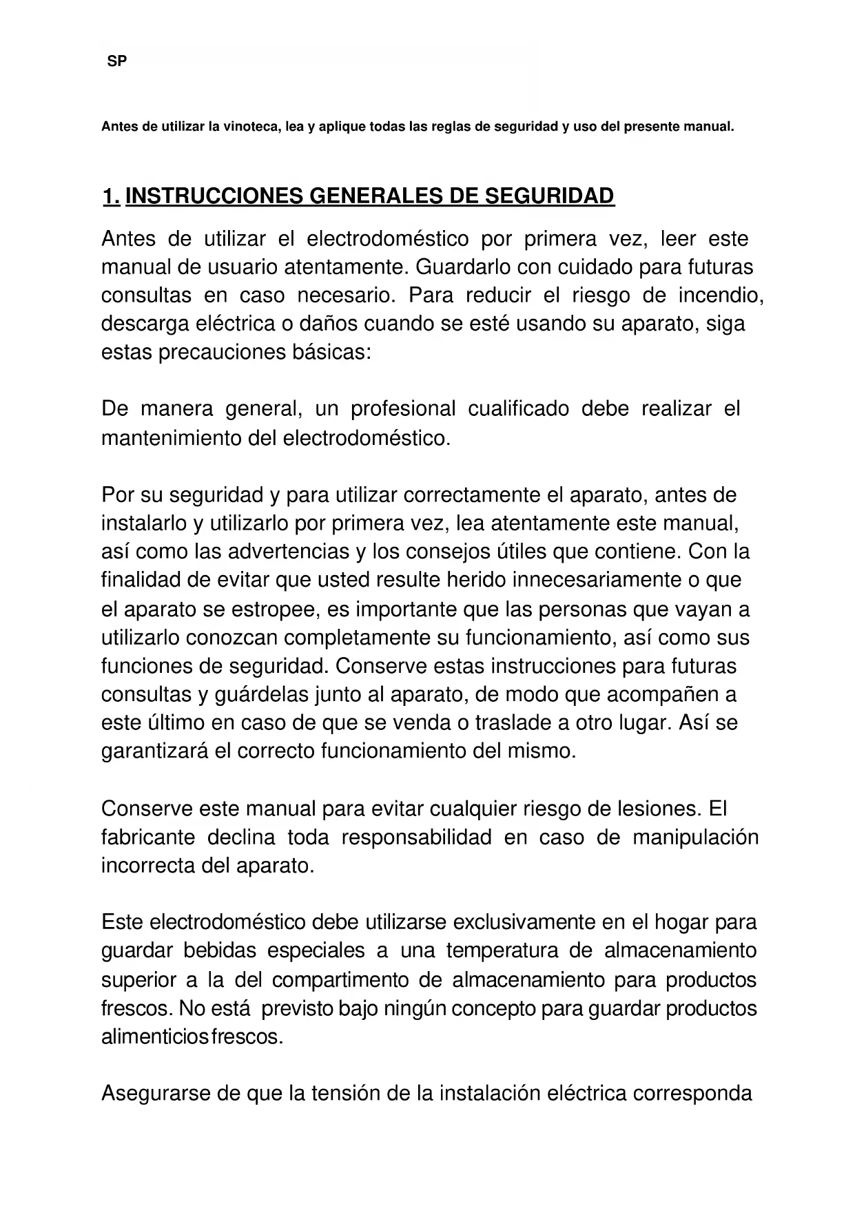Antes de utilizar el electrodoméstico por primera vez, leer este manual de usuario atentamente. Guardarlo con cuidado para futuras consultas en caso necesario. Para reducir el riesgo de incendio, descarga eléctrica o daños cuando se esté usando su aparato, siga estas precauciones básicas: De manera general, un profesional cualificado debe realizar el mantenimiento del electrodoméstico. Por su seguridad y para utilizar correctamente el aparato, antes de instalarlo y utilizarlo por primera vez, lea atentamente este manual, así como las advertencias y los consejos útiles que contiene. Con la finalidad de evitar que usted resulte herido innecesariamente o que el aparato se estropee, es importante que las personas que vayan a utilizarlo conozcan completamente su funcionamiento, así como sus funciones de seguridad. Conserve estas instrucciones para futuras consultas y guárdelas junto al aparato, de modo que acompañen a este último en caso de que se venda o traslade a otro lugar. Así se garantizará el correcto funcionamiento del mismo. Conserve este manual para evitar cualquier riesgo de lesiones. El fabricante declina toda responsabilidad en caso de manipulación incorrecta del aparato. Este electrodoméstico debe utilizarse exclusivamente en el hogar para guardar bebidas especiales a una temperatura de almacenamiento superior a la del compartimento de almacenamiento para productos frescos. No está previsto bajo ningún concepto para guardar productos alimenticios frescos. Asegurarse de que la tensión de la instalación eléctrica correspondaSP con la placa de identificación del electrodoméstico; este último debe estar conectado a un sistema a tierra autorizado. Las reparaciones o conexiones incorrectas pueden causar riesgos para la seguridad. En caso de duda, solicitar a un profesional que compruebe la instalación eléctrica. Esta unidad debe estar correctamente conectada a la toma de corriente a tierra para su protección. No cortar ni retirar el hilo de puesta a tierra del cable de la red eléctrica suministrado. Por razones de seguridad, no utilizar un cable alargador eléctrico. Si el electrodoméstico está estropeado (p. ej., si ha recibido un golpe fuerte) o ha sufrido algún daño (subida de tensión debida a relámpagos, inundaciones o incendios), puede resultar peligroso utilizarlo. Desconectar el enchufe de la red eléctrica y solicitar a un reparador profesional autorizado que compruebe el electrodoméstico. Para impedir los peligros, no reemplace usted mismo el cable estropeado de la red eléctrica. Ponerse en contacto con el distribuidor, un centro de reparación autorizado o un reparador profesional. Este electrodoméstico debe colocarse de tal manera que el enchufe de la red eléctrica esté accesible. No mover el electrodoméstico cuando esté lleno: podría deformarse su estructura y no ser posible su reparación. Las partes eléctricas no deben estar directamente accesibles.