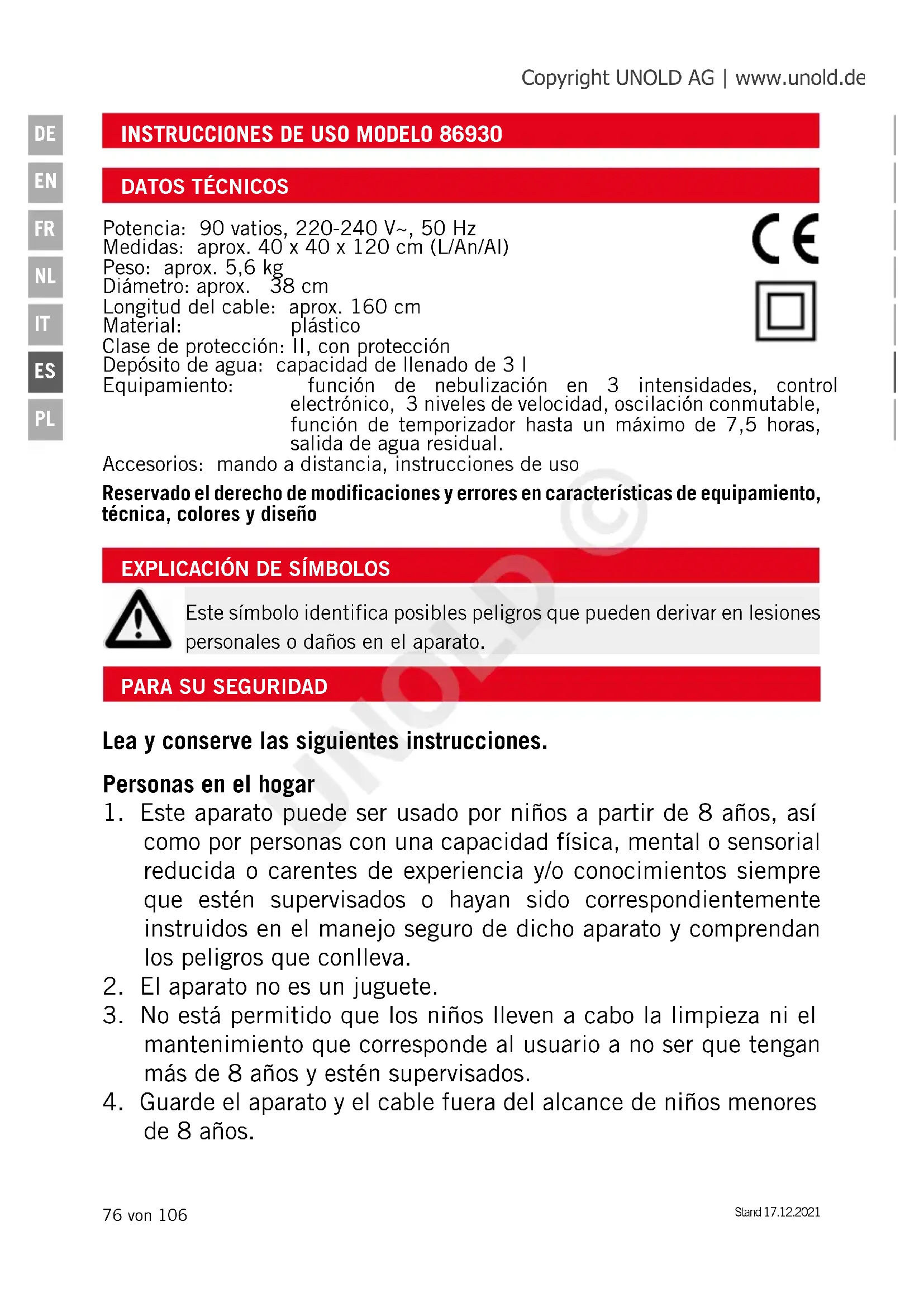 Potencia: 90 vatios, 220-240 V~, 50 Hz Medidas: aprox. 40 x 40 x 120 cm (L/An/Al) Peso: aprox. 5,6 kg Diámetro: aprox. 38 cm Longitud del cable: aprox. 160 cm Material: plástico Clase de protección: II, con protección Depósito de agua: capacidad de llenado de 3 l Equipamiento: función de nebulización en 3 intensidades, control electrónico, 3 niveles de velocidad, oscilación conmutable, función de temporizador hasta un máximo de 7,5 horas, salida de agua residual. Accesorios: mando a distancia, instrucciones de uso Reservado el derecho de modificaciones y errores en características de equipamiento, técnica, colores y diseño Copyright UNOLD AG | www.unold.de UNOLD ©Stand 17.12.2021 77 von 106